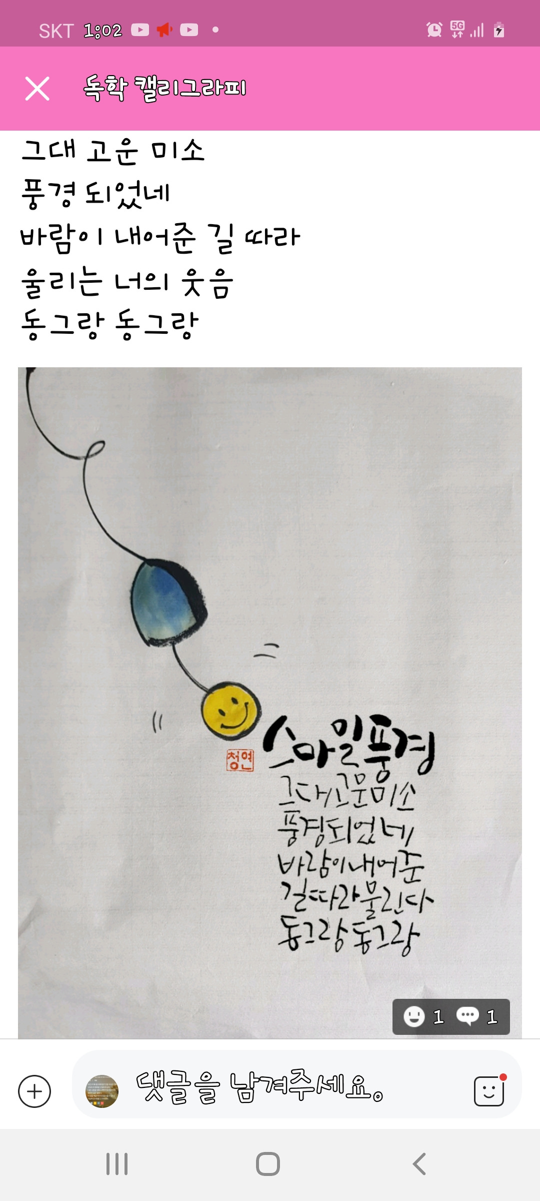 '우주'하면 나는 '별'보다 바람이 더 먼저 떠오른다. 문득 후욱ㅡ 하고 와닿아서일까? 누군가의 미소ㅡ'스마일 풍경' 네이버 밴드 '독학캘리그라피'에서 캡쳐
