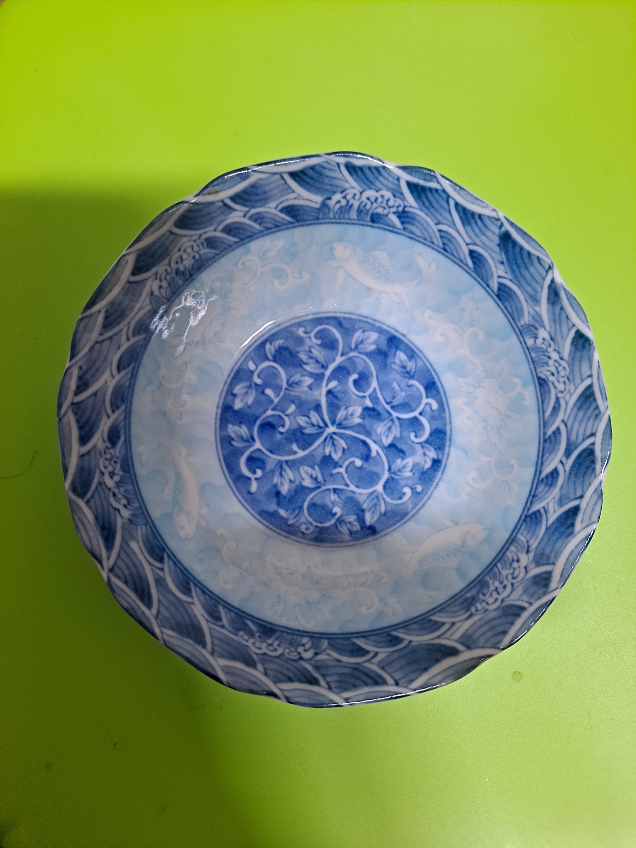 소포 상자 속에서 나온 도자기 접시, 꽃과 덩굴과 잎, 그리고 파도무늬, 자세히 보면 물고기들이 헤엄치고 ...한참을 들여다 보다.