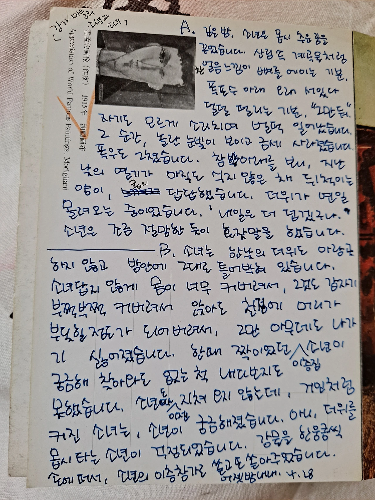 모딜리아니의 "검은 줄무늬가 있는 푸른 옷을 입은 소녀"란 그림 옆에 쓴 그날의 일이다:
