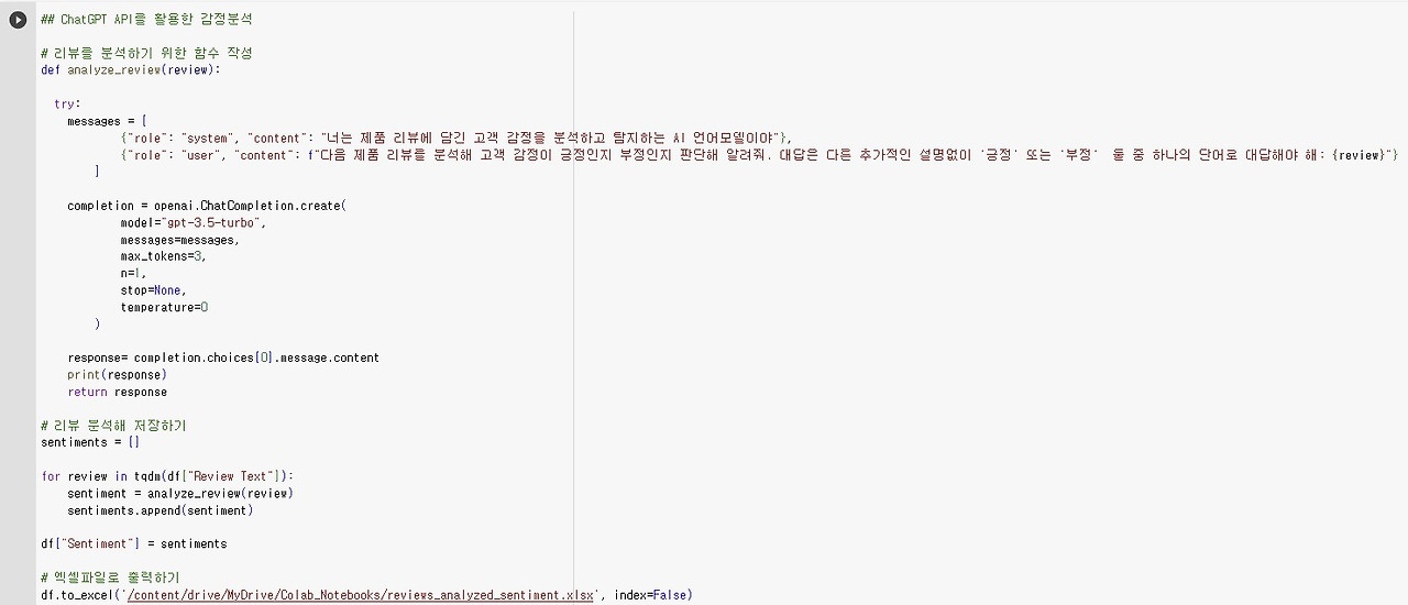 ChatGPT API와 파이썬으로 감성분석과 관련 키워드 분석, 그리고 제품 리뷰에 대한 1차 개선안까지 작성한 코드는 다음 코랩 파일에서 확인할 수 있다.