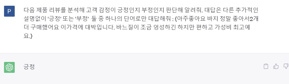 프롬프트는 지난 번 가이드에서 이야기한 것처럼 원하는 출력물의 형태('긍정' 또는 '부정')를 명확하게 정의했고 ```, """, < >, { }와 같은 delimiter를 활용해 입력 데이터를 구분하도록 했다. 프롬프트에 고객 리뷰 샘플을 넣으면 대답이 긍정과 부정 둘 중 하나로 대답하는 것을 볼 수 있다.