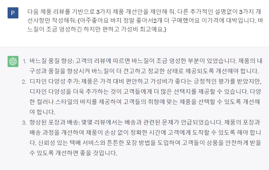 리뷰에 대한 감정분석을 하고 긍정, 부정의 단어들을 추출했다면 제품 리뷰를 바탕으로 개선안을 작성해 보자. ChatGPT가 가끔 엉뚱한 말을 하기도 하지만 1차적인 개선 아이디어를 빨리 정리하기에 유용하다.