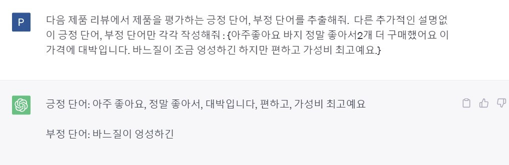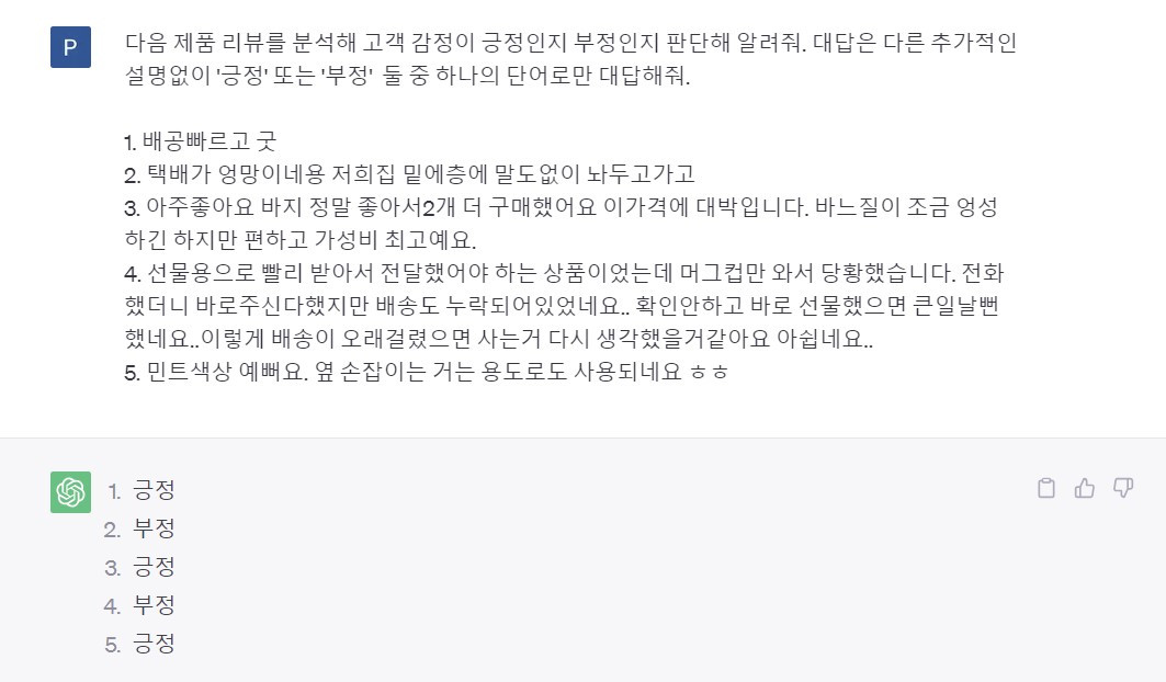 ChatGPT를 활용하면 머신러닝, 딥러닝 모델을 이용한 지도학습 없이도 감정 분석을 수행할 수 있다. 또한 이들 모델을 활용하려면 ‘긍정’ 또는 ‘부정’이라는 라벨이 붙은 정답 데이터가 있어야 하는데, ChatGPT는 사전 학습된 언어이해 능력을 바탕으로 문장에 담긴 감정·뉘앙스를 파악할 수 있기 때문에 감정 분석이 가능하다.