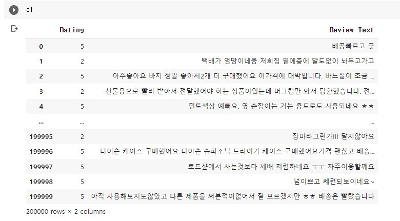 그럼, ChatGPT 웹 채팅창에서 고객 리뷰에 대한 감성분석을 진행해 보도록 하자. 데이터셋은 네이버 쇼핑에서 제품별 리뷰와 별점을 수집한 2020년 데이터를 활용했다. 참고로 한 가지 제품에 대한 리뷰가 아니라 쇼핑몰에서 여러가지 제품에 대한 후기를 크롤링한 데이터이고, 긍/부정으로 분류 하기 애매한 별점 (Rating) 3점에 해당하는 리뷰는 제외한 총 2만개의 데이터셋이다.