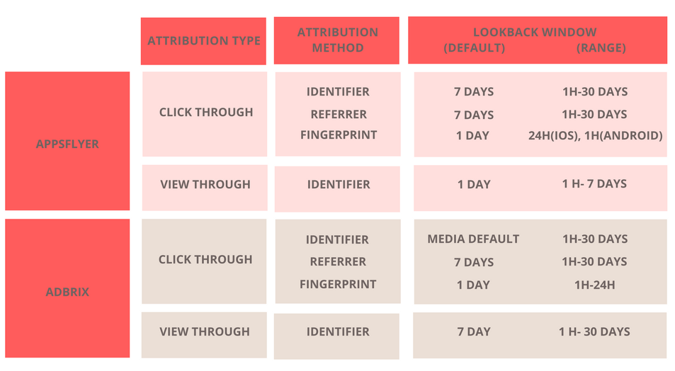 앱스플라이어와 애드브릭스의 경우 각 어트리뷰션 방법에 따라 윈도우 디폴트 값이 설정되어 있지만 역시 매체별로 윈도우를 조정하는 것이 가능하다. 물론 구글, 페이스북 등 일부 매체의 경우 자체 어트리뷰션 방법과 윈도우를 가지고 있어 조정이라는 말이 무의미할 수 있겠다.