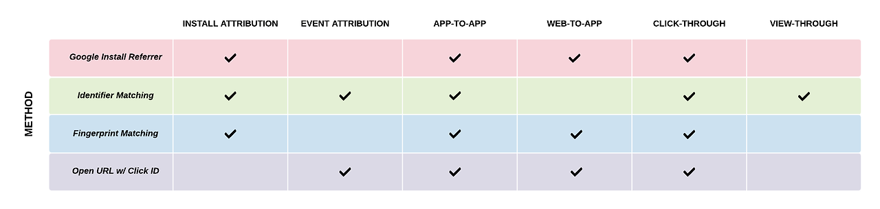이에 비해 모바일 어트리뷰션은 좀 복잡한 편이다. 모바일 앱에서는 쿠키를 사용할 수 없고 구글 플레이나 애플 앱스토어에서 일어난 앱 설치는 알 수가 없다. 그래서 모바일 어트립뷰션 툴들은 유저 디바이스를 구분하기 위해 여러가지 방법을 조합하고 광고하려는 앱에 탑재된 SDK에서 보내온 실행, 이벤트 정보를 광고 클릭과 일치시키는 과정을 통해 어트리뷰션이 이뤄진다.