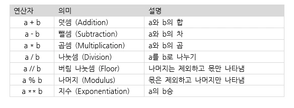 아래는 파이썬에서 사칙연산을 위해 사용하는 연산자들이다. 보통 우리가 계산시 사용하는 연산자와 거의 같고, 나눗셈에서 몫만 나타내거나 반대로 나머지만 나타내는 경우 기호를 한 번 더 봐두면 좋을 것 같다.