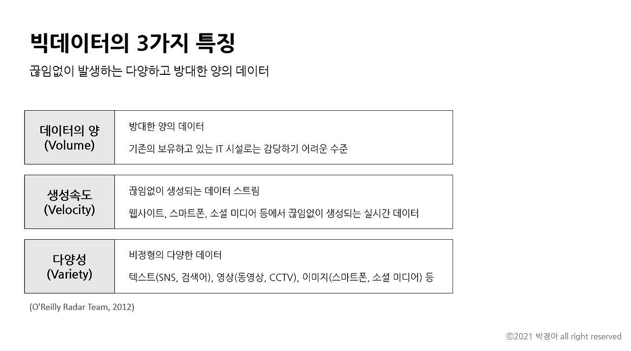 두 번째 챕터는 그렇다면 빅데이터란 무엇인가에 대해서이다. 빅데이터의 특징은 우선 양(Volume)이 많다는 것이다. 많다는 것이 어떤 수치적인 기준이 있는 것이 아니라 기존의 회사 IT 설비로는 감당하기 어려운 수준을 말한다. 그리고 실시간으로 끊임없이 발생해 생성속도가 빠르고, 숫자와 같은 정형화된 데이터 말고도 텍스트, 이미지, 동영상 등 데이터들이 다양하다(Variety)는 점이다. 즉, 실시간으로 끊임없이 발생되는 아주 많은 양의 다양한 데이터라고 할 수 있다.
