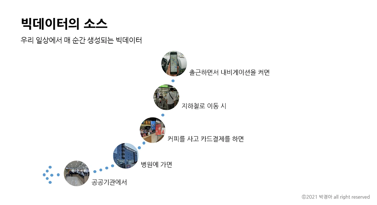 내비게이션을 켜면 비교적 덜 막히는 곳으로 길을 안내하는 데, 서비스 업체는 우리에 앞서서 달리는 차들의 시간당 위치변화를 실시간으로 분석해 우리에게 안막히는 길을 알려준다.
