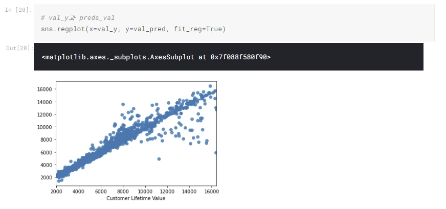 예측 목표가 되는 LTV값 자체를 씨본 라이브러리를 활용해 살펴보면 LTV가 2만 달러 이하에 집중적으로 분포되어 있고 사분범위의 최대값(16,414)을 벗어나는 이상치 데이터가 많음을 알 수 있었다. 이상치 데이터는 819개로 전체 데이터의 약 10%에 해당한다.