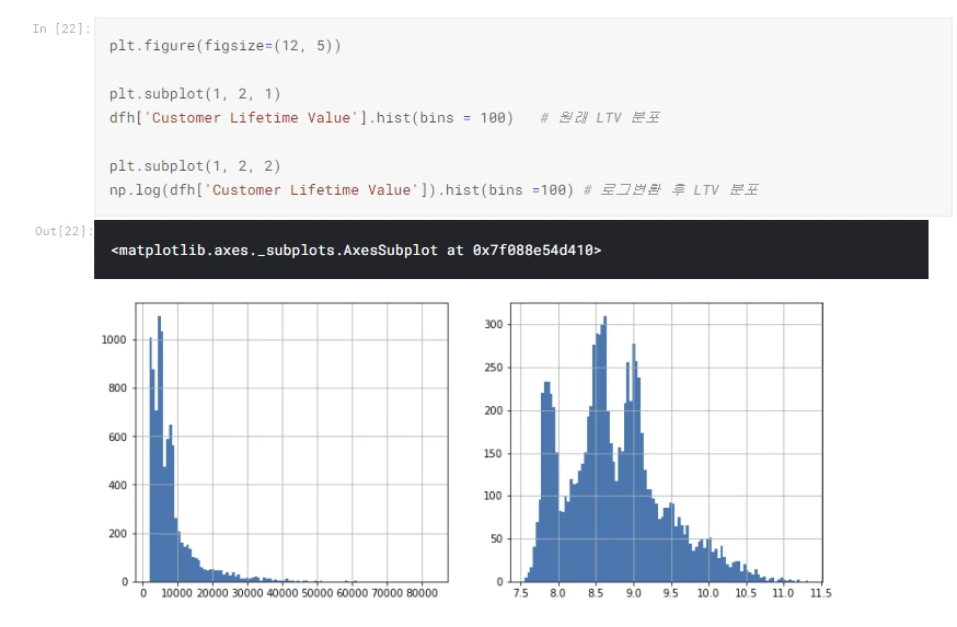 원래 LTV 분포 vs. 로그변환 처리 후 LTV 분포