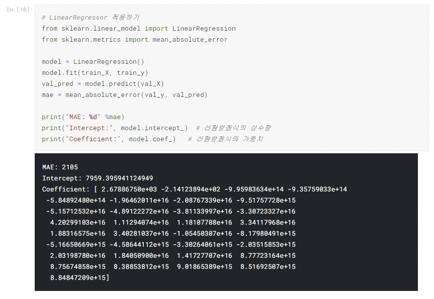 선형 회귀를 적용한 결과 MAE가 2,105로 랜덤 포레스트을 적용했을 때 나온 베스트 결과인 1,516보다 오차가 크다. 앞서 사용한 알고리즘들과 함께 선형회귀 알고리즘도 포함해 LTV 이상치 처리, 종속변수 LTV 스케일링, 앙상블을 적용해 테스팅 해보았다.