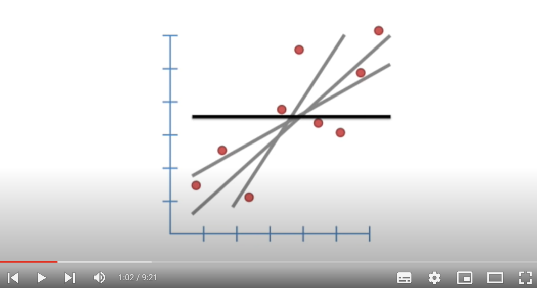다음과 같은 데이터들이 있을 때 추세선을 그릴 수 있을 것이다. 어떻게 선을 그으면 좋을까? 종속변수(Y)의 평균값을 가지면서 X축에 평행한 직선에서부터 시작해 선을 점차 회전시켜보자. 언제 실제 Y값과 예측Y값의 오차제곱합(SSR, Residual Sum of Squared)이 가장 작을까? 점차 선을 회전시킬수록 SSR은 줄어들 것이다.