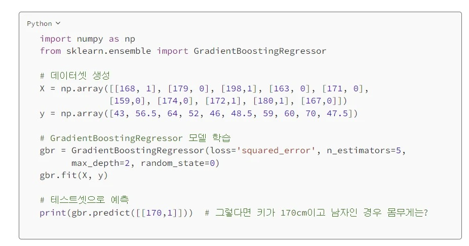 예시로 든 키 성별 데이터셋을 만들고 사이킷런의 GradientBoostingRegressor 알고리즘을 불러와 학습시킨다. 학습기(n_estimators)는 5개로 설정했고, 최대 분기(max_depth)는 2번으로 설정했다. 새로운 테스트 데이터는 학습된 모델에 predict 함수를 붙여 예측할 수 있다.