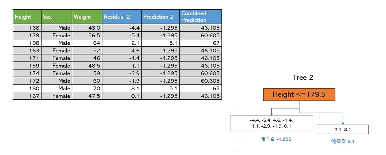 두 번째 학습기 역시 실제 몸무게에서 앞서 업데이트된 최종 예측값을 뺀 잔차를 계산하고 이를 학습해 역시 잔차가 가장 줄어드는 분기점을 택해 분기한다. 이번에는 Height <=179.5를 기준으로 분기했으며 각 리프의 예측값은 -1.295와 5.1이 된다. 이를 앞서 최종 예측값에 더하면 다시 최종 예측값이 업데이트 된다.