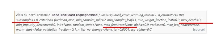 마찬가지로 사이킷런의 그라디언트 부스팅 회귀 라이브러리를 활용해 간단히 모델링을 해보자. 그라디언트 부스팅 역시 랜덤 포레스트와 마찬가지로 의사결정나무를 활용한 앙상블 모델이므로 의사결정나무의 하이퍼 파라미터 설정할 수 있다.