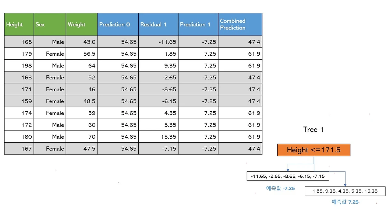 첫 번째 학습기는 잔차를 학습하고 잔차가 가장 줄어드는 분기점으로 Height <=171.5를 택해 분기했으며 각 그룹의 예측값은 각각 -7.25와 7.25가 된다. 이를 초기 예측값에 더하면 최종 예측값(Combined Prediction)이 업데이트된다.