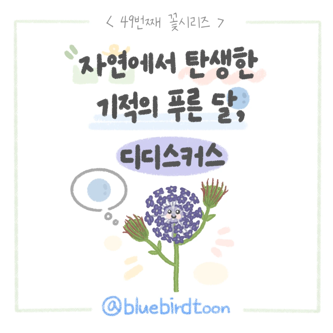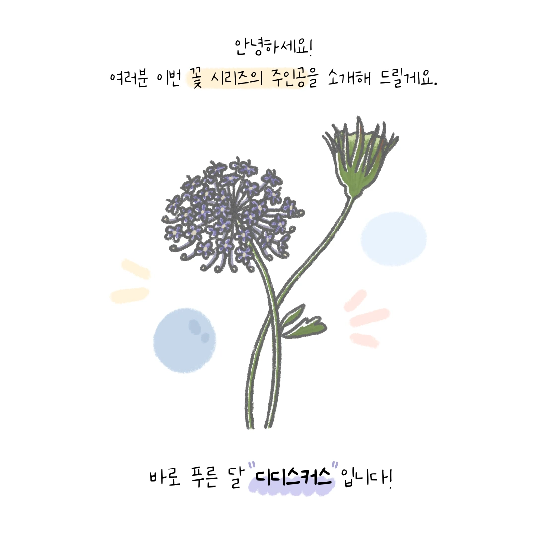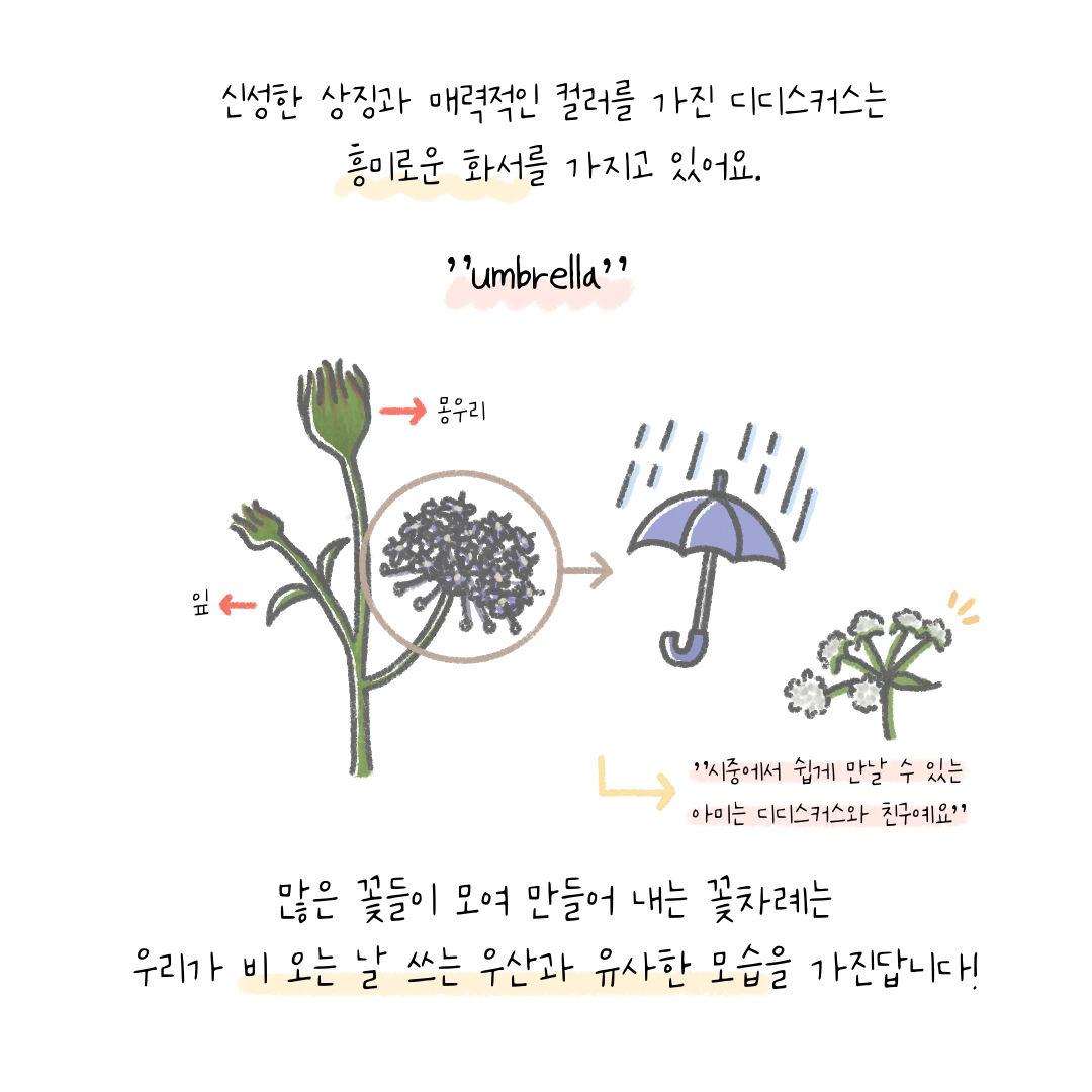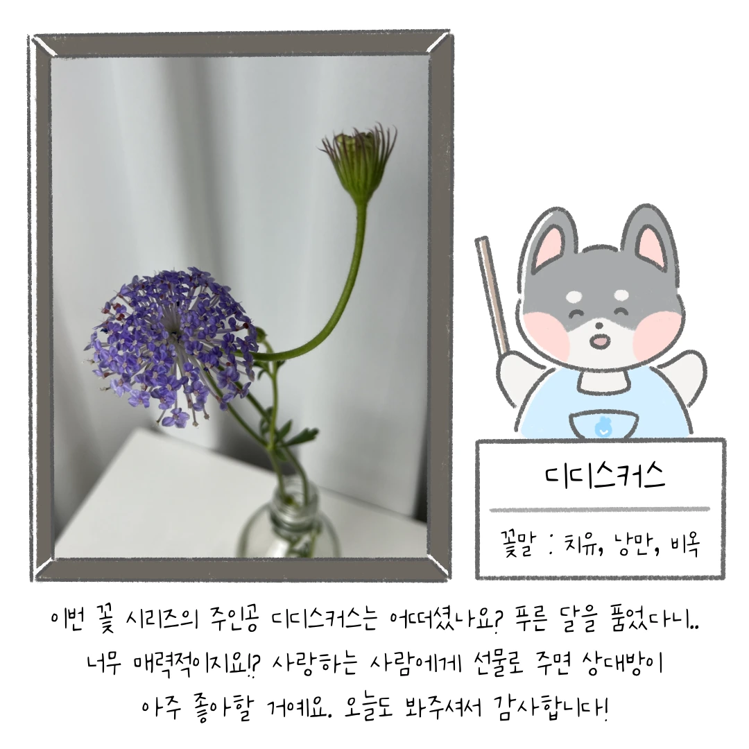 A. 디디스커스를 특별히 좋아해서 선택한 것은 아니에요. 단지 오랫동안 저희 인스타툰을 즐겨 주셨던 팔로워 분이 이 꽃에 대해서 정리해 달라고 요청하셔서 49번째 주인공으로 다뤘답니다.