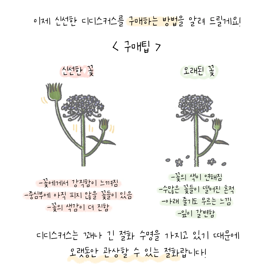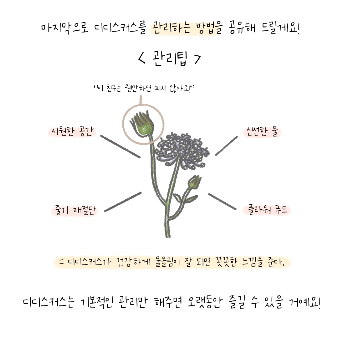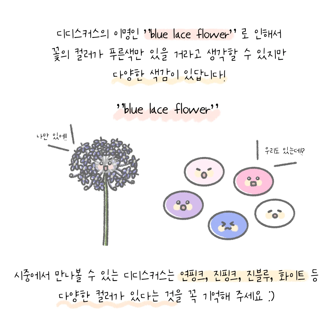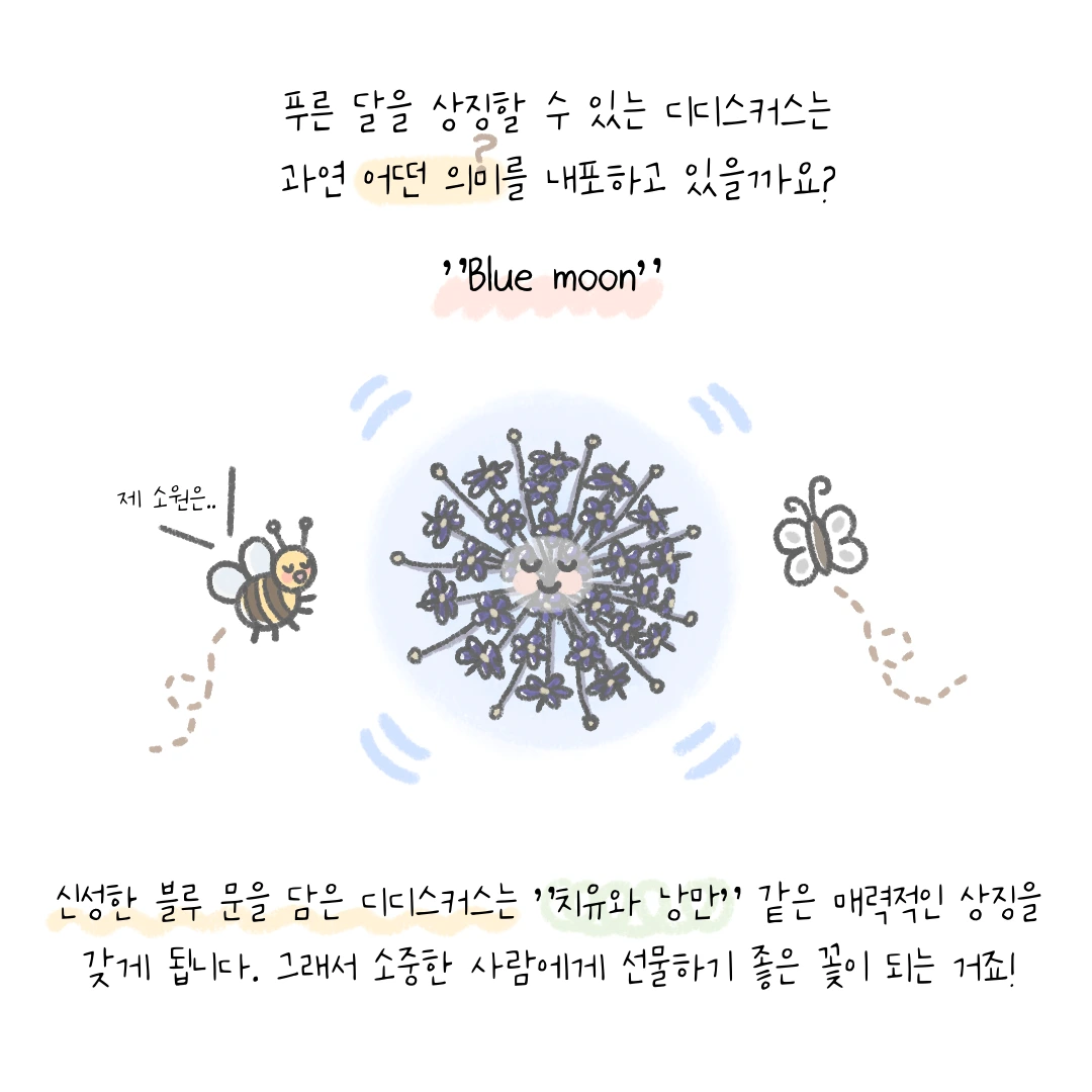 A. 디디스커스를 특별히 좋아해서 선택한 것은 아니에요. 단지 오랫동안 저희 인스타툰을 즐겨 주셨던 팔로워 분이 이 꽃에 대해서 정리해 달라고 요청하셔서 49번째 주인공으로 다뤘답니다.
