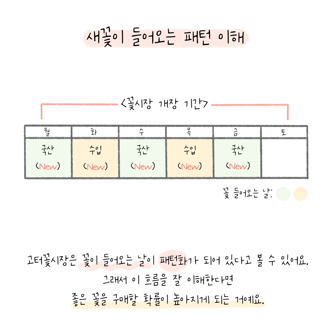 고터꽃시장의 경우, 꽃이 들어오는 패턴은 어느 정도 정립이 되어 있다고 보시면 돼요. 사실 이런 단순한 정보도 잘 파악하지 못한 화훼업계 사람들이 많다는 것에 놀랐어요. 이는 꽃시장이 가지고 있는 정보가 폐쇄성을 가졌다는 것으로도 해석이 가능한 부분이지 않을까 싶네요. 이러한 패턴이 널리 알려지지 않는다면 누구에게 유리할지를 생각하면 간단하게 그 원인이 해석될 겁니다.