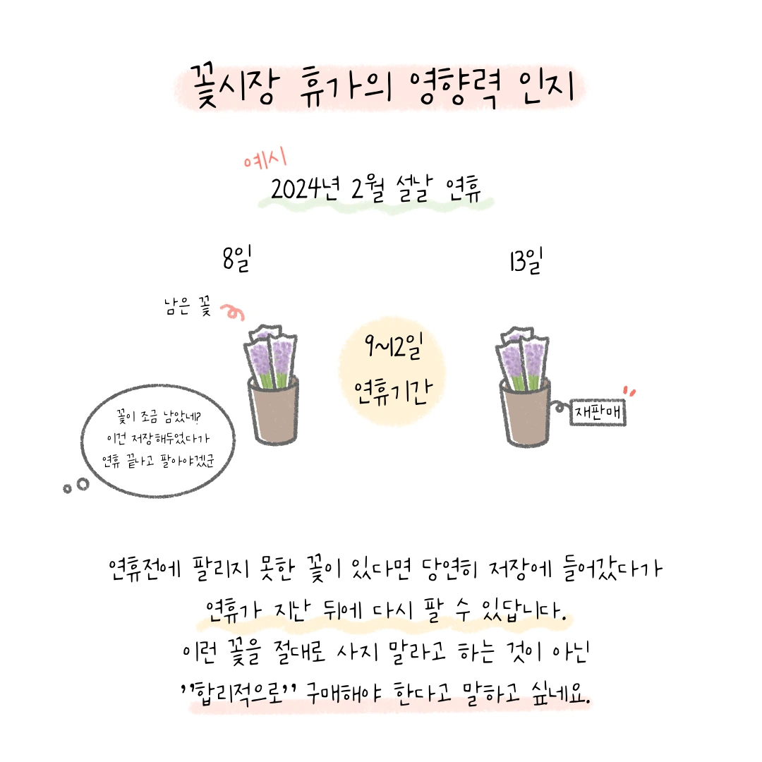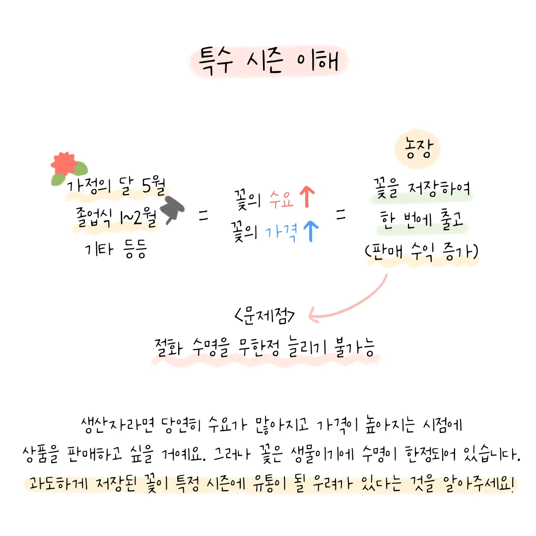 특수 시즌은 사실 도매시장보다는 농장과 더 관련이 많아요. 특수 시즌에는 여러 꽃들의 시세가 올라가게 돼요. 그러면 당연히 공급자 입장에서는 이 시즌에 많은 꽃을 유통하려고 하겠죠. 카네이션 같은 꽃은 절화 수명이 길고 저장도 오랫동안 할 수 있기 때문에 큰 문제는 발생하지 않아요. 그러나 저장에 큰 영향을 받는 꽃이 있어서 이슈가 발생할 수 있는 가능성을 배제할 수 없다는 취지로 팁 목록에 추가하여 공유하였던 거예요. “사람은 언제나 양심적이야” 라고 말할 수 있는 사람은 없을 겁니다. 이러한 생각을 벗어날 수 있는 영역이 과연 있을지 궁금하군요.