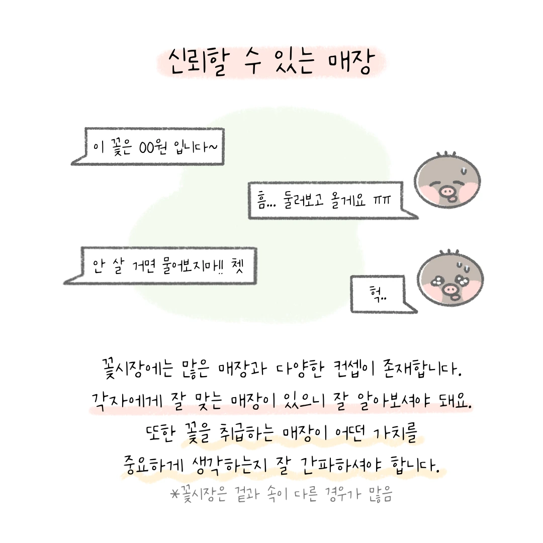 본 게시물의 주제인 “꽃시장에서 좋은 꽃 고르는 법”을 올려 드리고 그 뒤에 추가적인 디테일을 덧붙일게요. 꽃과 관련된 만화를 더 보고 싶으시면 인스타그램 공식 계정에 들어가 다양한 콘텐츠들을 즐기시면 됩니다.