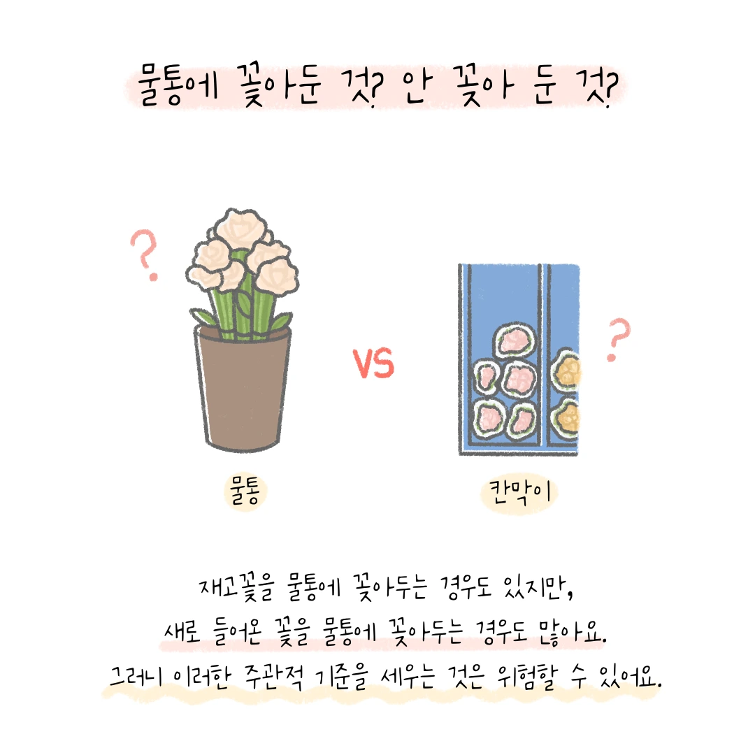 그럼에도 불구하고 생화가 입고된 지 며칠이 지나지 않았는데 재고꽃이라고 표현하는 것은 좀 이르다고 생각하기도 해요. 왜냐하면 하루이틀이 지난 꽃을 오래된 꽃이라고 칭하기에는 꽤나 완벽한 컨디션을 가지고 있는 경우가 많기 때문이에요. 그래서 판별 기준을 최소한 3~4일 정도가 지났으며 꽃의 컨디션이 좋지 못한 꽃을 재고꽃이라 칭하는 것이 어떨까.. 하는 의견을 조심스럽게 내고 싶네요. 사실 “이쁘게 잘 피어 있는 상태의 꽃”을 언급할 때 재고꽃이라는 표현을 쓰면 꽃의 입장에서 서운함이 밀려오지 않을까 싶기도 하거든요. 여하튼 생화를 취급하는 입장에서 보수적으로 생각한 것이니 소비자의 관점에서 충분히 다를 수 있다는 가능성을 배제하시면 안 돼요.