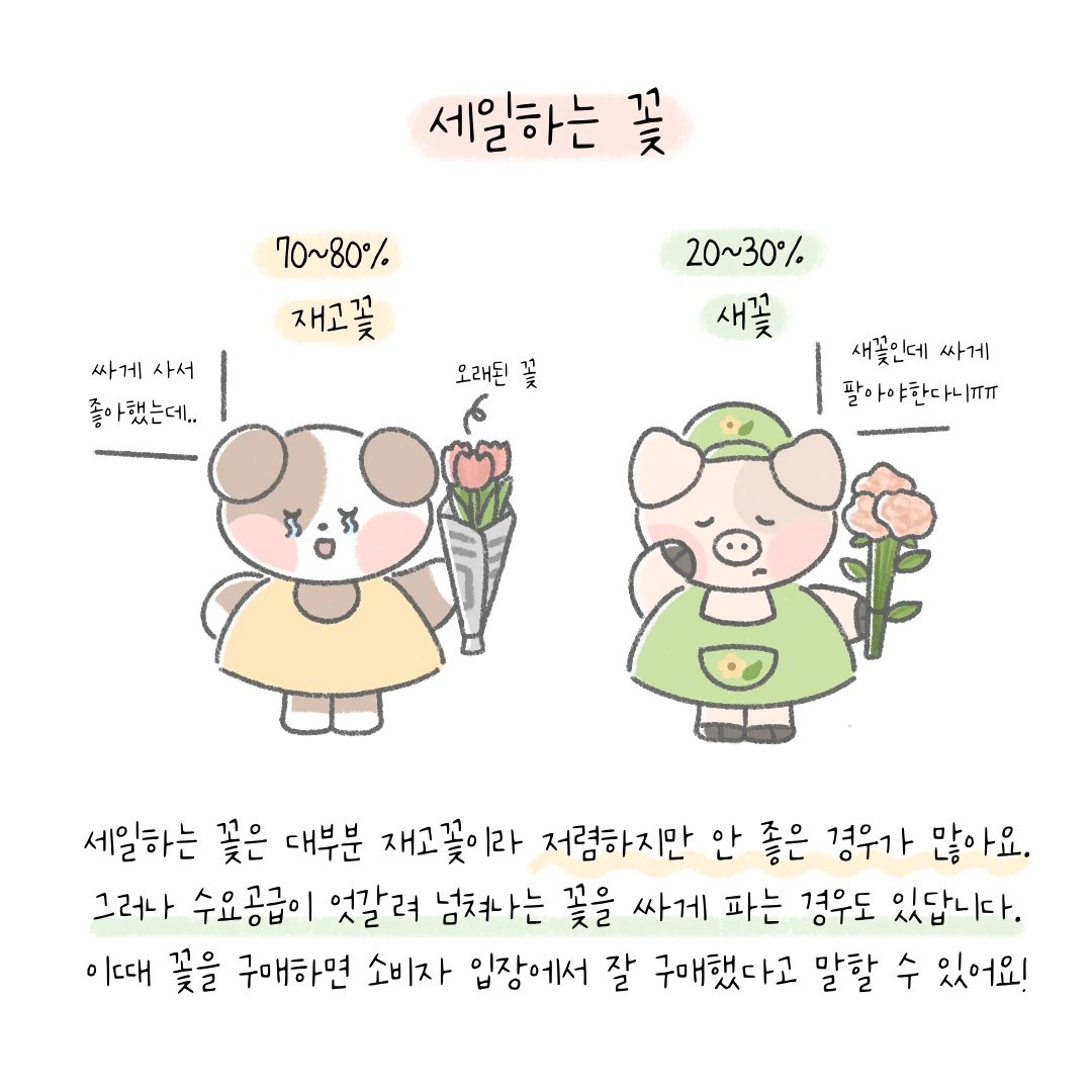 보통 세일하는 꽃은 재고꽃일 확률이 높아요. 물론 공급이 넘쳐나서 꽃의 시세가 떨어지는 경우도 많기 때문에 속단할 수는 없답니다. 만약 꽃마다 가지고 있는 특징을 잘 이해하고 있는 사람이라면 좋은 소비를 할 수 있을 거예요. 근데 일반인은 특정 꽃이 피어서 유통이 되는지, 안 피어서 유통되는지 모르기에 쉽지 않을 겁니다. 그 외 다양한 요인 또한 통제하는 것이 어려울 테니 더더욱 좋은 소비를 하는 건 쉽지 않을 거예요.
