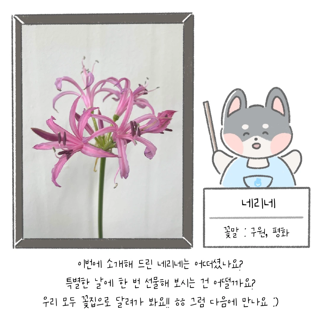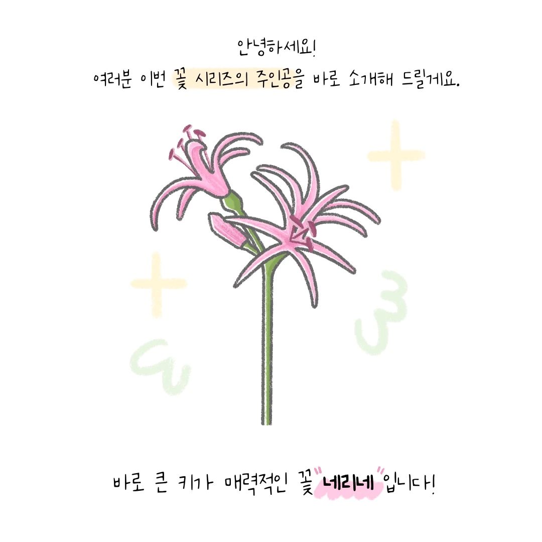 그래서 네리네의 경우 흥미로운 신화적 배경을 통해 탄생할 수 있는 꽃말(구원 등)을 마지막 페이지에 넣었던 것이랍니다. 이외에도 네리네가 가지고 있는 꽃말은 당연히 많아요. 단순히 나열하여도 우아함, 여성, 연결, 행복, 안전 등 다양해요.