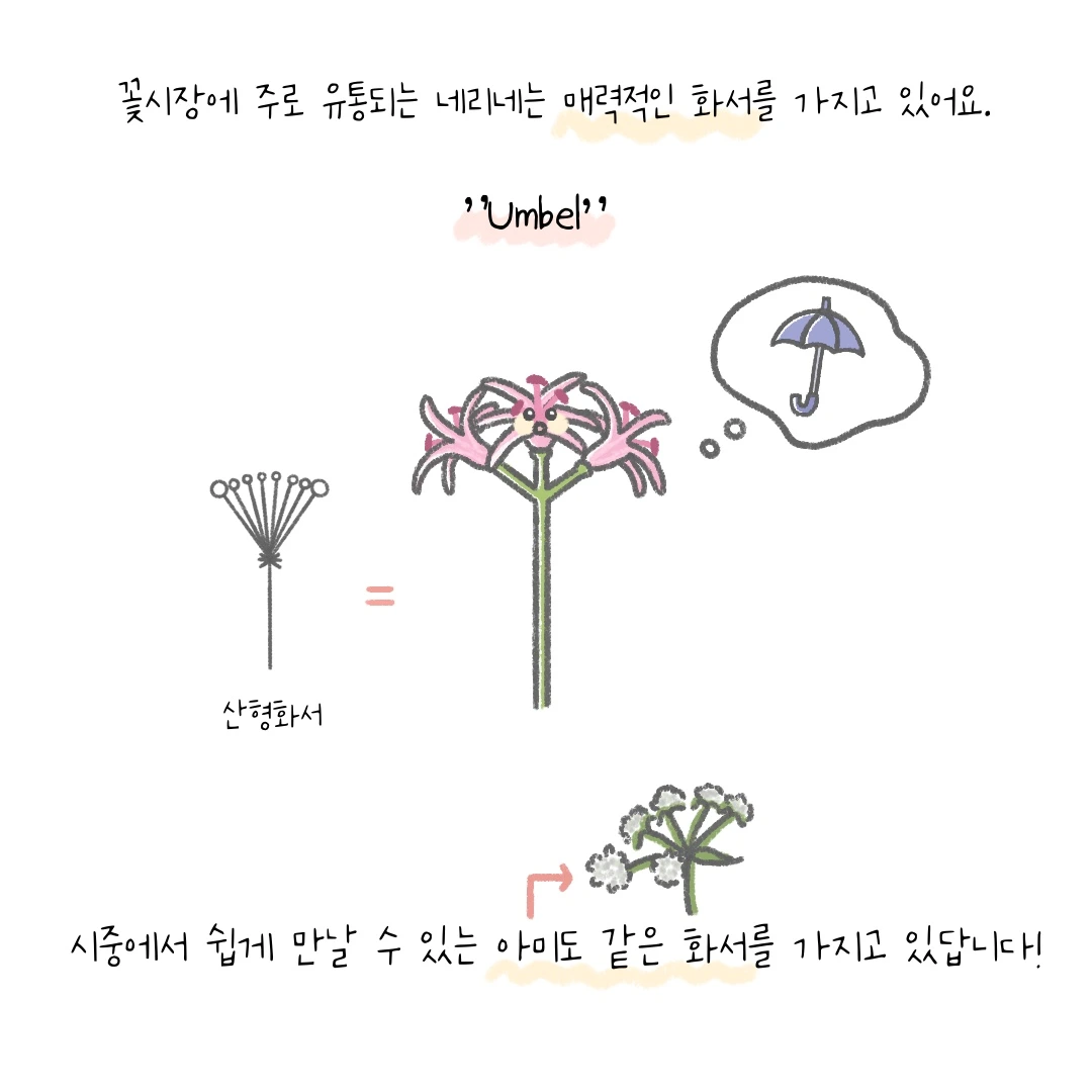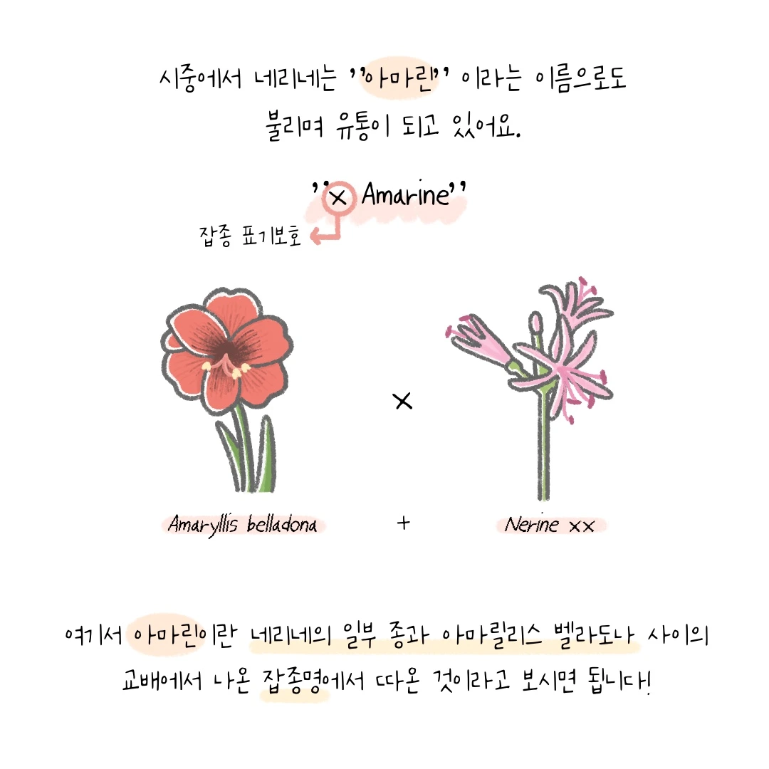 이번에는 50번째 꽃시리즈에 대한 비하인드를 가볍게 풀어보려고 해요. 주인공이 된 꽃의 이름은 “네리네”였습니다. 꽃의 이름에 있어서 여럿 이야기가 오고 갈 수 있지만, 꽃시장의 관점에서 풀어 나간다는 것을 감안했을 때 별다른 문제가 없을 거예요. 네리네(nerine)라는 꽃은 꽃시장에서 네리네 또는 아마린으로 불리면서 판매가 되고 있어요. 그래서 꽃시장에 방문하는 사람들이 정말 많이 물어보는 단골 질문이 생기게 되었답니다.