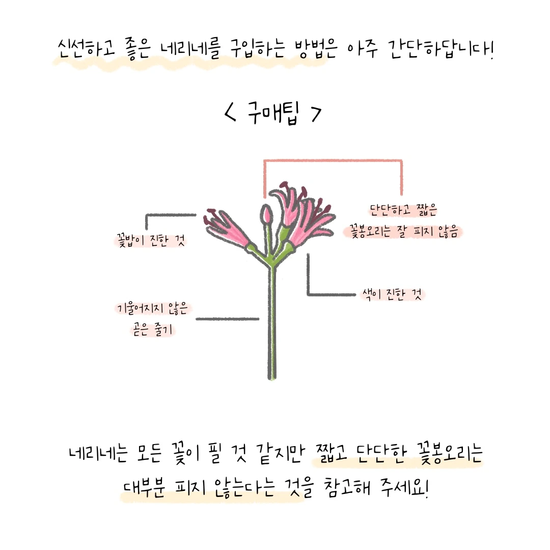두 개의 이름을 가져서 혼동을 유발하는 네리네는 일주일에 한 번 수입으로 들어오는 꽃이라고 말할 수 있어요. 보통 손님들에게 수입꽃이라고 설명을 하면 꽃의 가격이 비싸다는 것을 자연스럽게 유추하는 것 같아요. 실제로 네리네는 꽃시장에서 꽤나 비싼 꽃에 속하기도 합니다. 그래서 가격 때문에 구매를 망설이는 경우가 정말 많고 황급히 자리를 뜨는 사람도 많아요. 아무래도 선뜻 구매하기가 쉽지 않은가 보겠죠? 근데 꽃의 수명을 생각해 보면 그렇게 아깝다는 생각을 할 정도는 아니라고 봐요. 저는 이 꽃을 한 달 이상 관상해 본 경험이 있답니다. 물론 특정한 환경 요건을 갖추고 적절한 관리를 해주었기 때문에 가능한 것이지만요. 어찌 됐든 일반적인 생화의 수명인 7일을 감안하면 네리네를 구매하는 것은 합리적인 소비가 될 수 있는 겁니다.