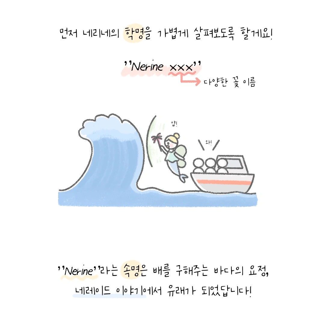네리네 꽃과 얽혀 있는 신화적 스토리를 아는 사람들은 은근히 많이 있어요. 솔직히 해외 자료를 통해 식물을 공부하는 사람이라면 한 번 정도는 다 들어봤을 겁니다. 만화에서는 네레이드 이야기라고만 해석했는데, 실제로 다양하게 각색이 되어 공유되고 있고 네리네를 더 매력적인 꽃으로 만들어 주고 있답니다.