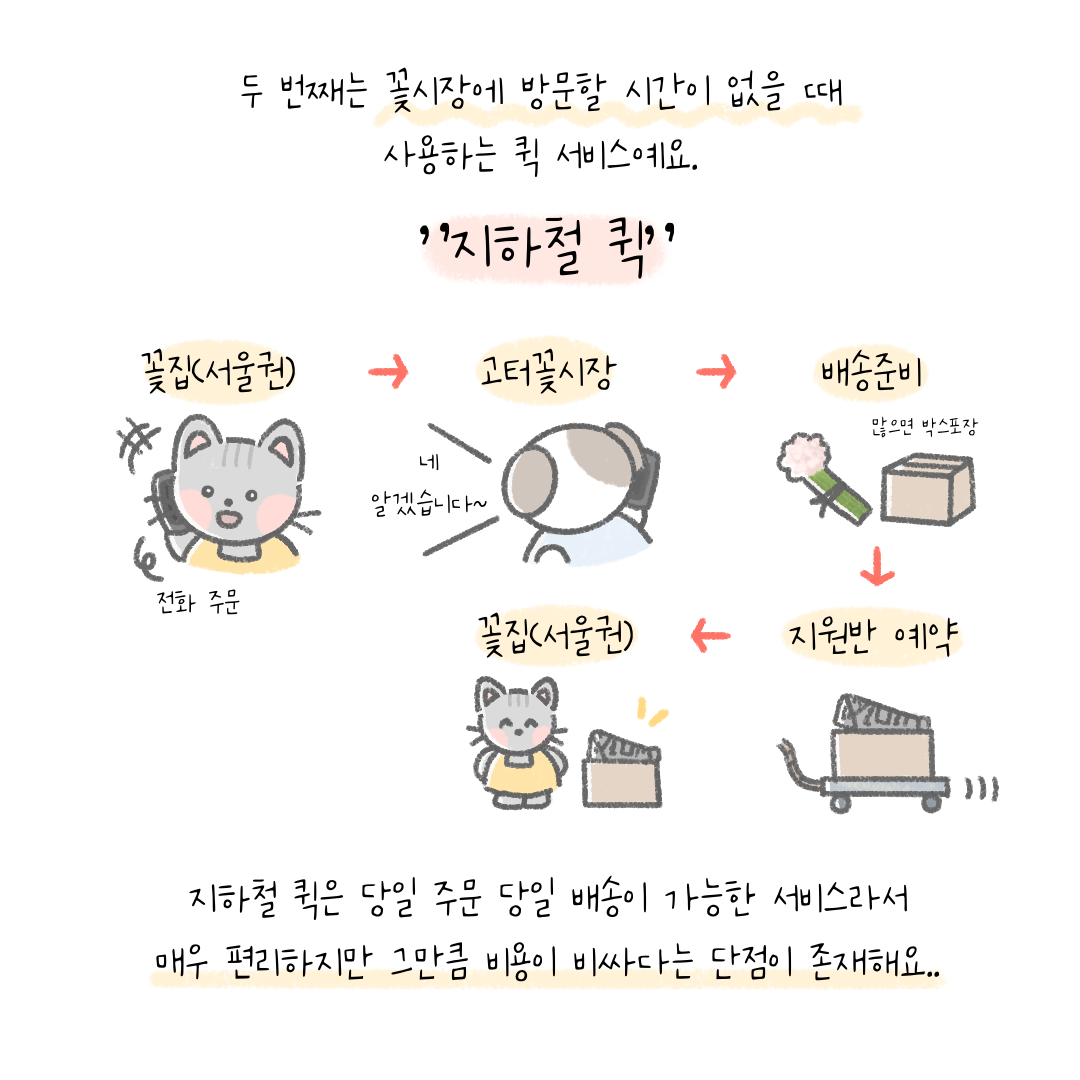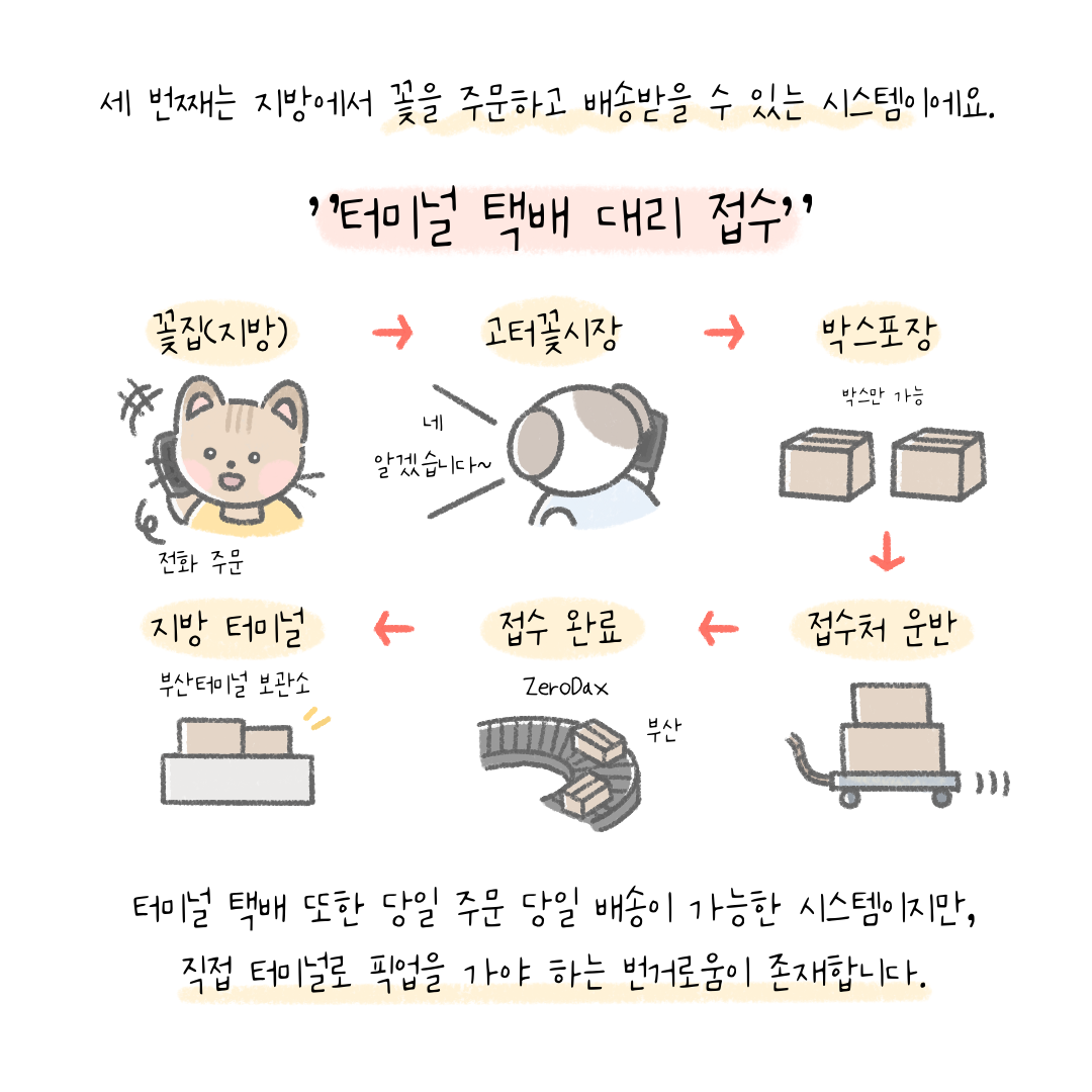 터미널 택배는 만화에서 설명했던 것처럼, 꽃집(지방)에서 지방 터미널까지 배송 6단계를 거치게 돼요.