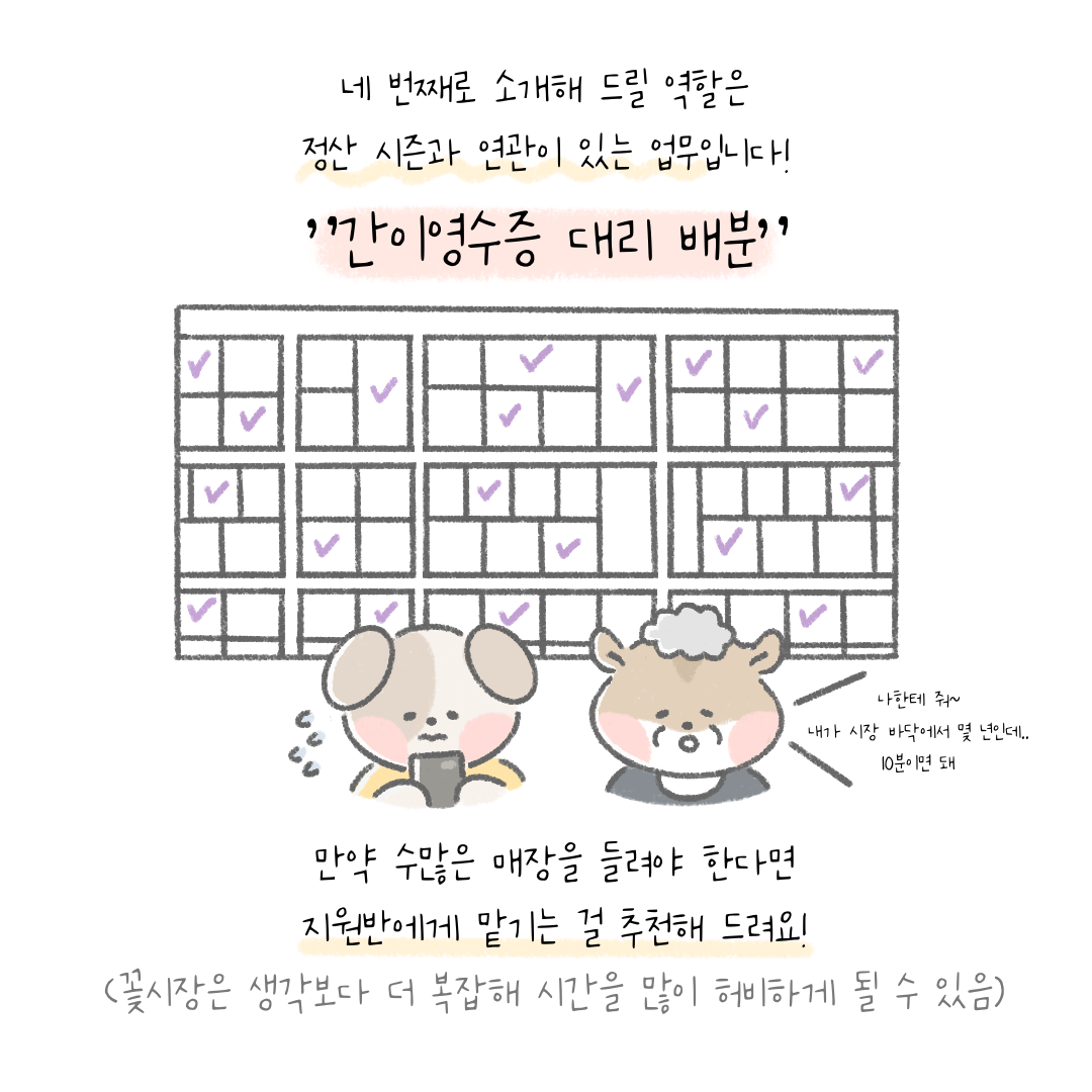 간이영수증 대리 배분은 주로 결산 시즌 때 목격할 수 있어요. “대리 배분”은 지원반이 영수증 뭉치를 들고 시장을 재빠르게 돌면서 각 매장에 필요한 영수증 자료를 대신 전해 주는 거예요. 만약 사업자가 시장을 직접 돌아다니면서 나눠주게 되면 긴 시간이 소요될 수도 있어요. 이는 꽃시장이 생각보다 복잡한 공간이기 때문이랍니다. 그래서 시장 바닥에 오래 머무르다 보니 시장길이 훤해진 지원반에게 부탁하는 것은 시간을 버는 행동이 된 거죠