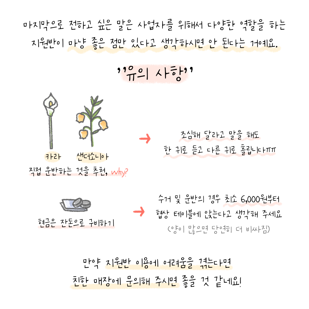 사실 지원반의 존재 이유 중 가장 큰 비중을 차지하고 있는 것이 생화 수거 및 운반이에요. 도매시장을 주로 이용하는 업자의 특성상 꽃을 많이 사입해야 되는 경우가 많기 때문에 이러한 역할을 하는 지원반이 자연스럽게 많아지게 된 겁니다.