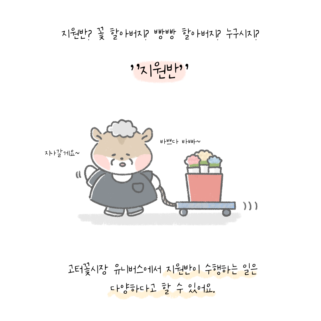 여하튼 고터꽃시장에는 드러나지 않게 보조적인 역할을 수행하는 사람들이 많이 있어요. 그들이 바로 “지원반”입니다. 지원반은 고터꽃시장이 원활하게 운영될 수 있도록 다양한 지원을 하는 엔진이라고 표현할 수 있어요. 이들의 역할은 세부적으로 나누어져 있고 각자 가지고 있는 강점(차량 소유 여부 등)에 따라 수요가 다릅니다(예를 들어 다마스 차량을 소유하고 있는 지원반의 경우 수요가 많기 때문에 예약하기가 어려운 경우가 많음)