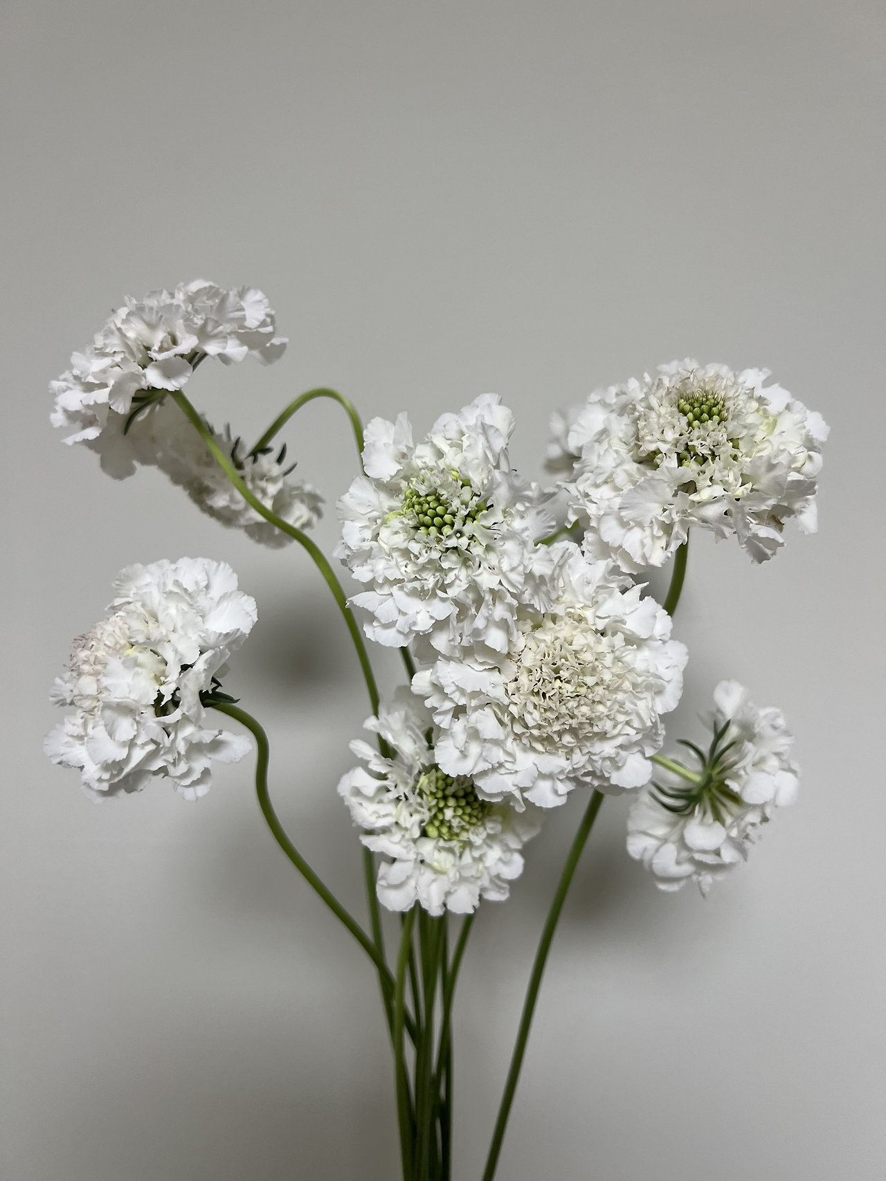 얇은 줄기로 인해서 구불구불한 라인감이 형성되는데, 이는 스카비오사의 매력적인 특징 중에 하나입니다. 하지만 일반인들은 스카비오사의 줄기가 꺾여 있는 모습을 보고 꽃이 시들거나 꽃이 오래되었다고 마음대로 판단을 하는 경우가 많아서 조금 아쉬운 부분이 있는 것 같아요. 사실 꽃의 라인감이 스카비오사의 자연스러운 모습이니까요. 다양성이 존중되는 꽃의 세계에서 ”무조건 꽃은 직립해야 돼 !“라는 식의 단언은 좋지 않은 것 같네요.