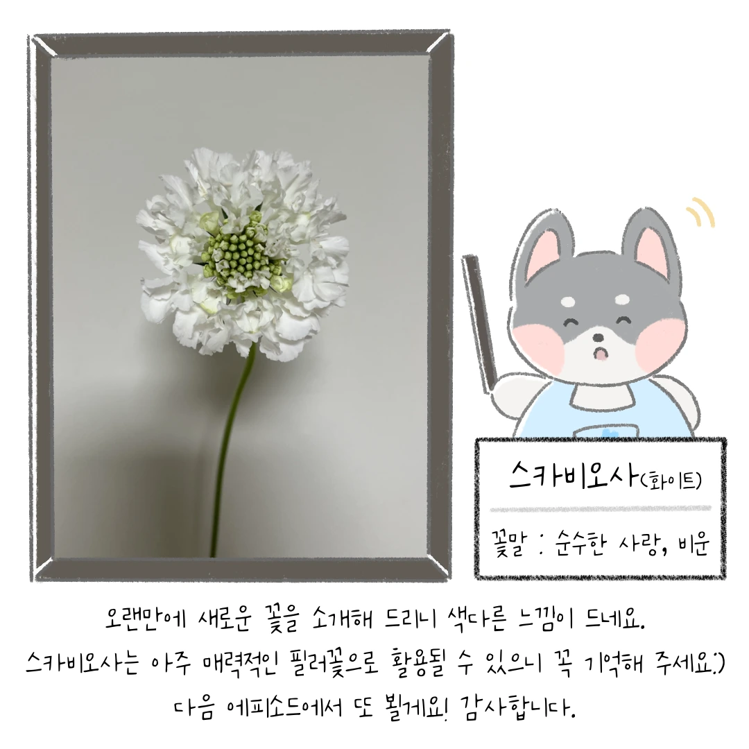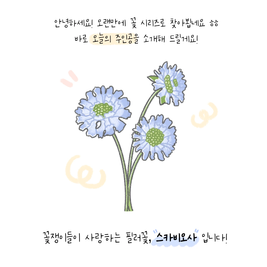 여러분 ! 혹시 “스카비오사” 라는 꽃에 대해서 들어 보신 적 있으신가요? 꽃을 좋아하는 사람이라면 알고 있는 기본적인 꽃에 속하지만 일반적인 경우에는 잘 모르는 사람이 더 많은 것 같네요. 저는 꽃시장에 항상 있다 보니 다양한 꽃을 마주한답니다. 그래서 스카비오사 같은 매력적인 꽃을 매번 만나는 것 같아요. 스카비오사는 플로리스트들이 애정하는 *필러꽃 중에 하나라고 볼 수 있어요. 하지만 가격대가 막 저렴한 편은 아니라서 꽃다발에 1~2송이를 끼워 넣어서 연출하는 경우가 일반적이랍니다.