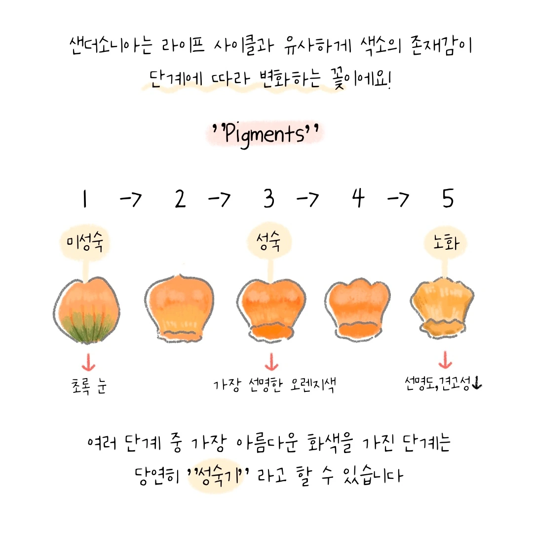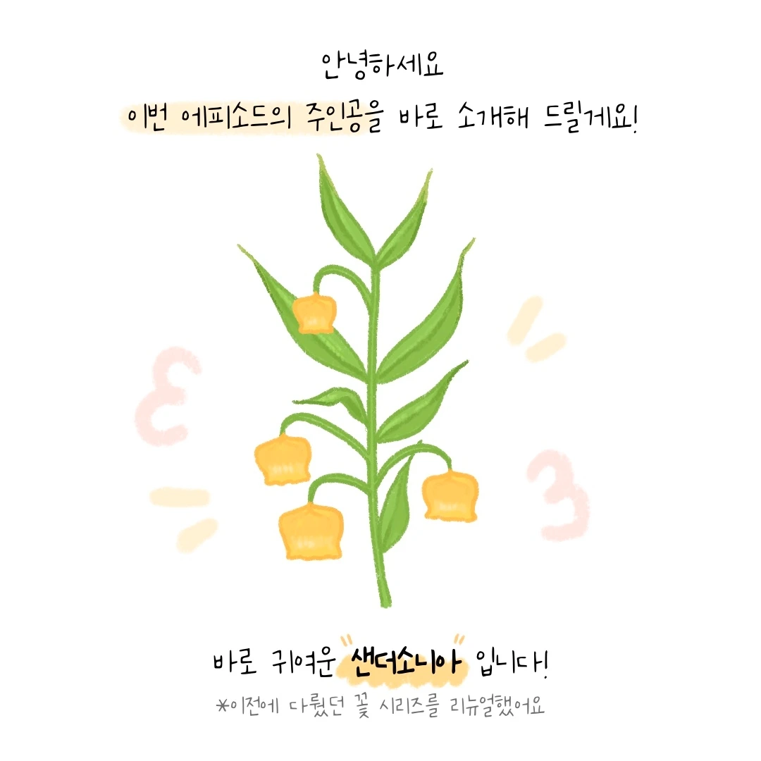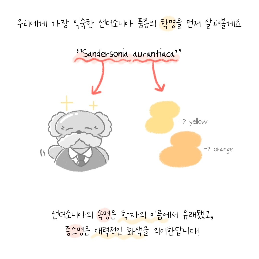 안녕하세요. 이번 글은 작년 8월 즈음에 다루었던 꽃에 대해서 간단히 이야기를 해볼게요. 꽃의 이름은 “샌더소니아”입니다. 아마도 처음 들어본 사람들이 더 많을 것으로 예상이 되지만 꽃을 잘 아는 사람들은 샌더소니아라는 꽃을 들어 보셨을 거예요. 화색은 달콤해 보이는 오렌지색입니다. 실제로 보면 너무나도 귀엽기 때문에 소비자의 구매 욕구를 자극하는 매력적인 꽃이라고 할 수 있어요.