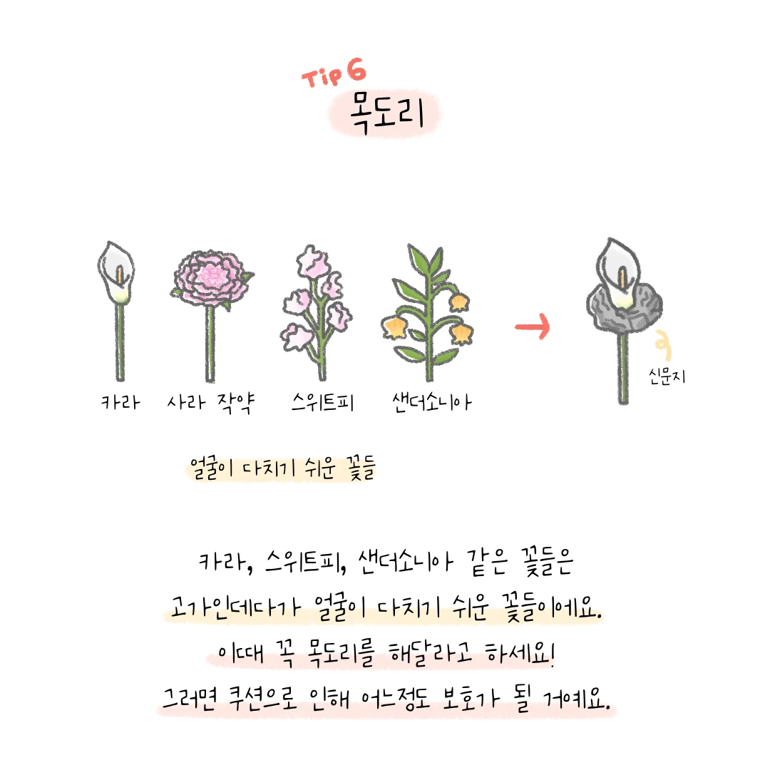 6) 목도리 : 꽃의 특성상 목 부분이 얇아서 부리지기 쉬운 꽃들이 있어요. 이럴 때 그냥 신문지로 돌돌 말아서 포장하면 이동 중에 부러질 가능성이 높습니다. 이를 방지하기 위해서 꽃 목 부분을 싸달라고 해야 돼요. 또한 얼굴이 다치기 쉬운 꽃들(예를 들면 스위트피, 카라 등)도 웬만하면 목도리를 해주고 포장해 달라고 요청하셔야 합니다. 이것을 안 하는 경우가 있는데 보통 저렴한 품종을 판매할 때 그러는 것 같아요. 같은 카라이지만 등급의 차이로 인해서 목도리가 불필요할 수 있거든요.