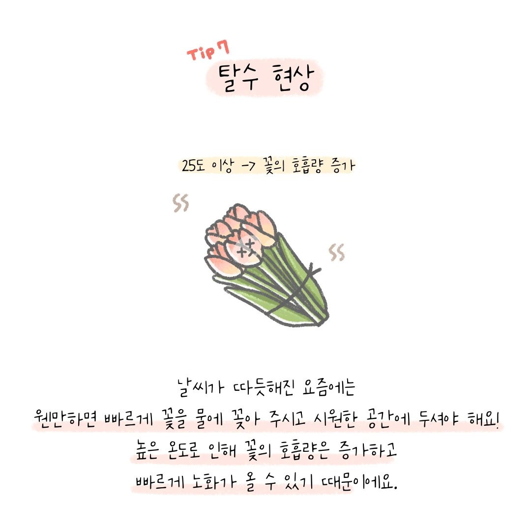 7) 탈수현상 : 요즘같이 날씨가 더워지면 꽃들의 호흡량은 증가할 수 있습니다. 이때 물에 꽂지 않고 돌아다니는 시간이 길어지면 꽃이 탈수 현상을 보일 수 있으니 빠르게 물공급을 해주셔야 돼요. 많은 분들이 꽃을 구매하고 식사를 하러 가시는데 기온이 높을 때에는 식사를 스킵하고 꽃을 먼저 챙기는 것을 추천합니다.