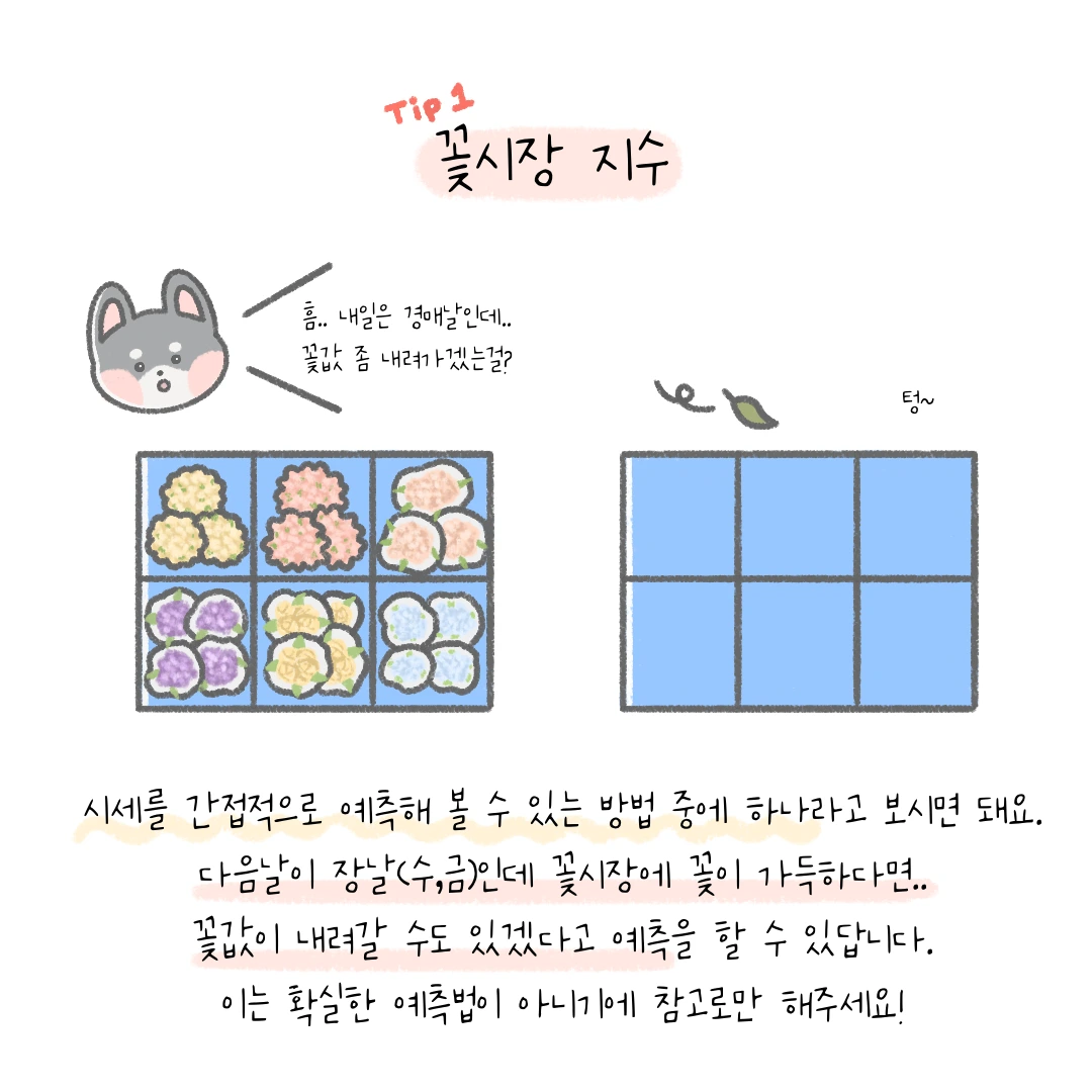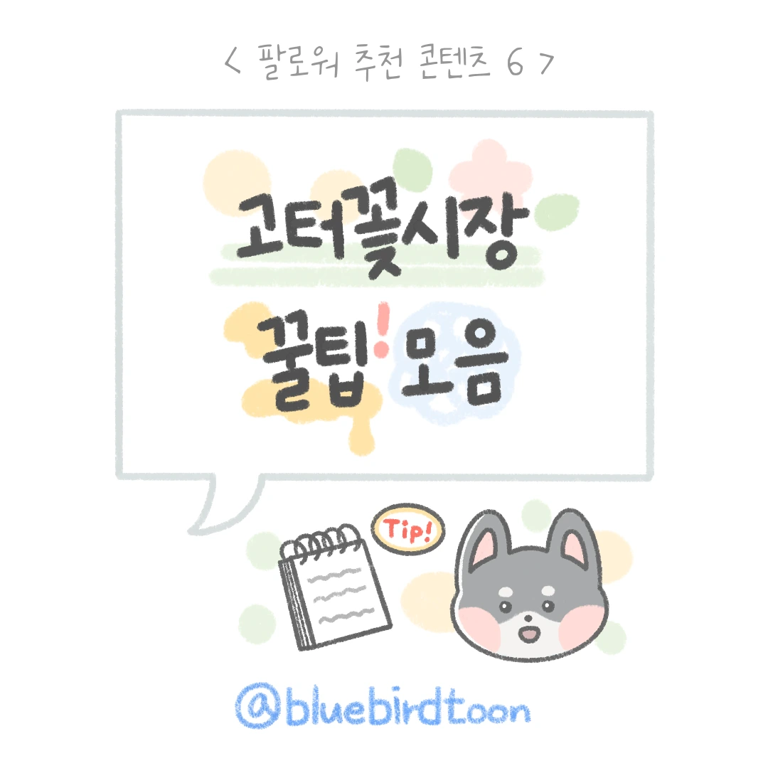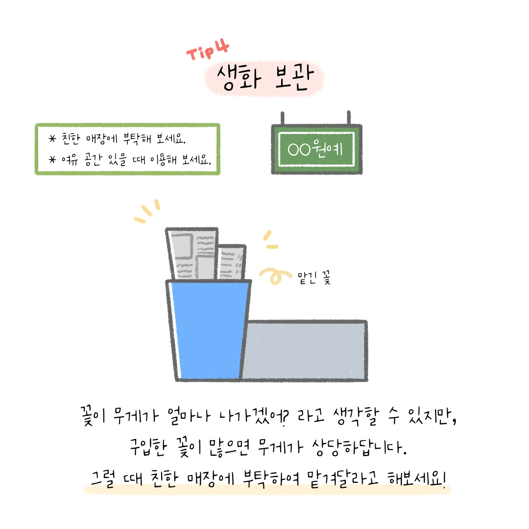 고터꽃시장에서 유용하게 활용할 수 있는 팁들을 공유합니다. 운영회에서 공식적으로 제작한 것은 아니기에 저의 주관이 들어가 있을 수 있지만 도움이 되실 거라고 생각해요. 먼저 글로 가볍게 읽어 보시고 만화를 통해 이해해 보도록 할게요.