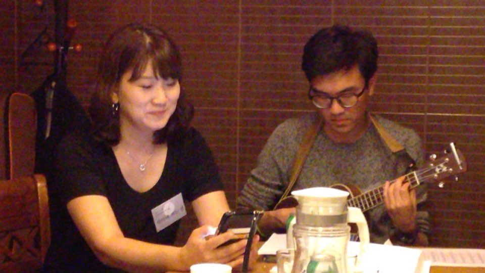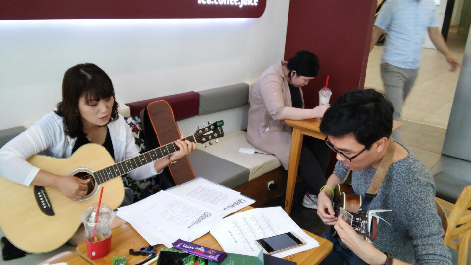 자연스럽게 사람이 많지 않은 카페에서 비장의 무기 기타와 우쿨렐레를 꺼낸다.