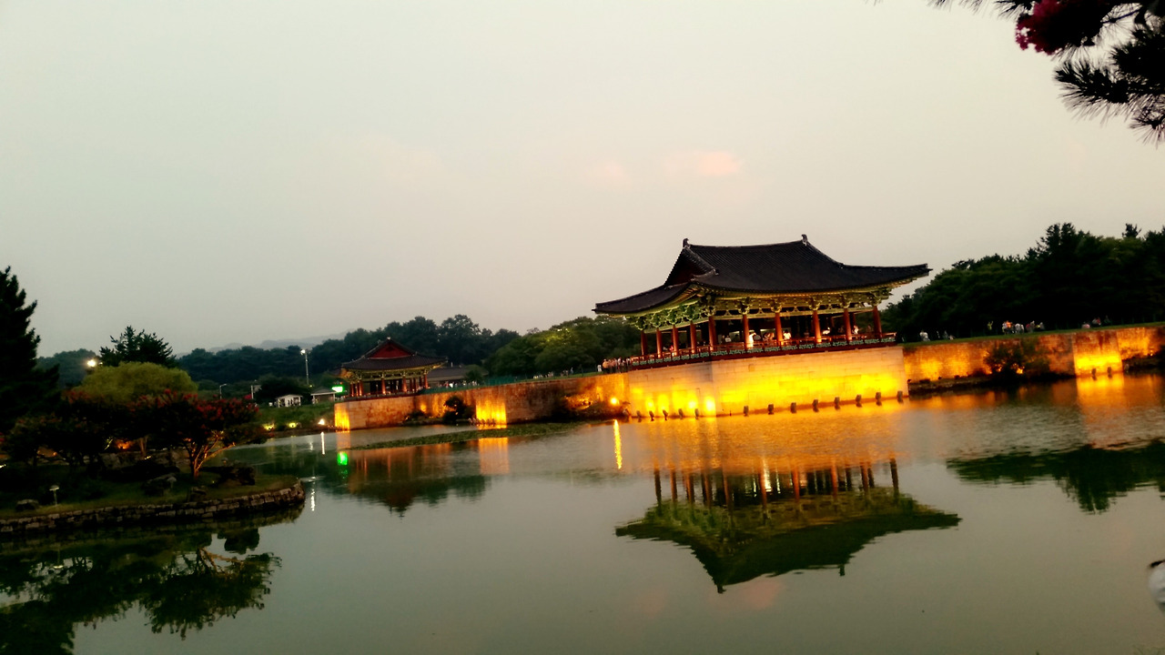 붉은 노을과 안압지의 조명의 경계가 모호해질 때 즈음..