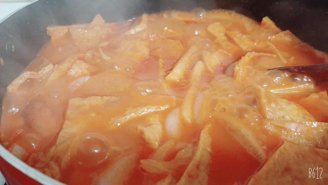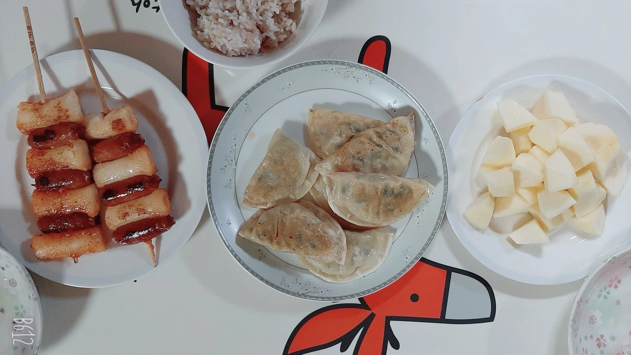 떡볶이와 구운 만두, 그리고 소시지 떡 튀김, 사과를 곱게 깎아서 시간 맞춰 피시방에서 퇴근해 주신 아들과 딸과 둘러앉아 맛있게 먹었습니다.