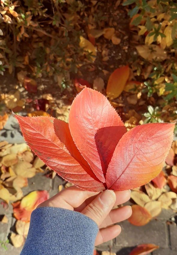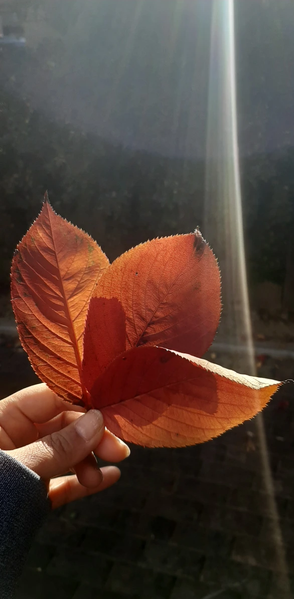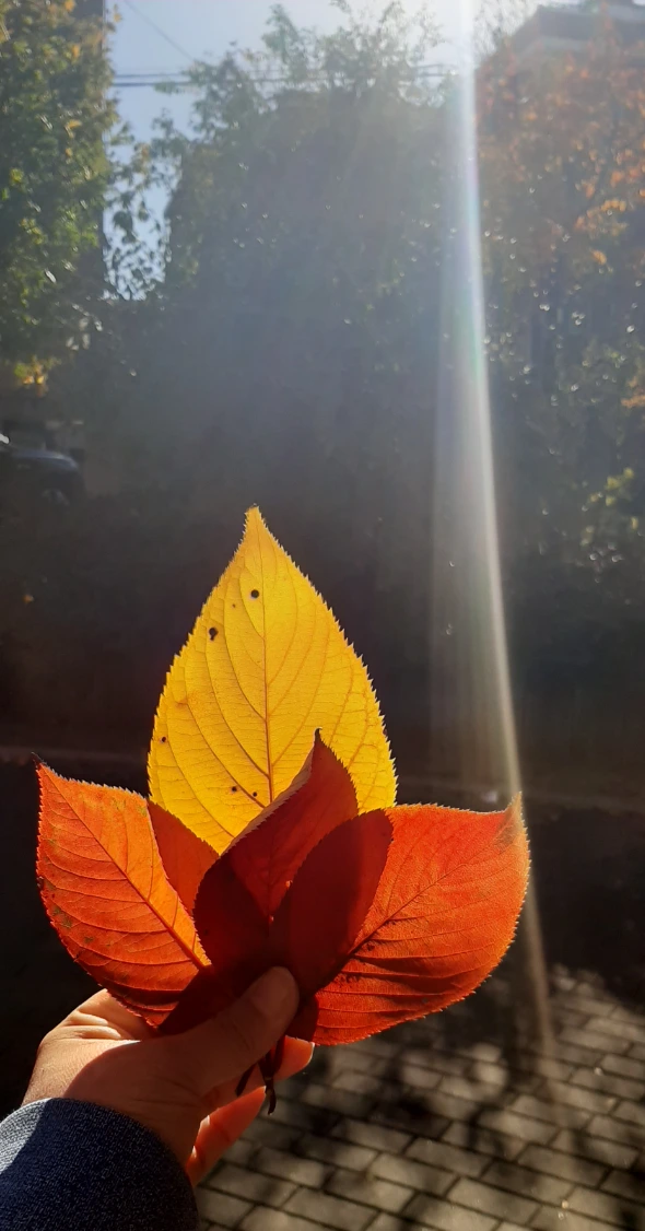 가을이 저물어 가고 있음이 아쉬워 땅에 떨어진 고운 빛깔의 나뭇잎을 주워 이래저래 햇볕에 비춰본다.