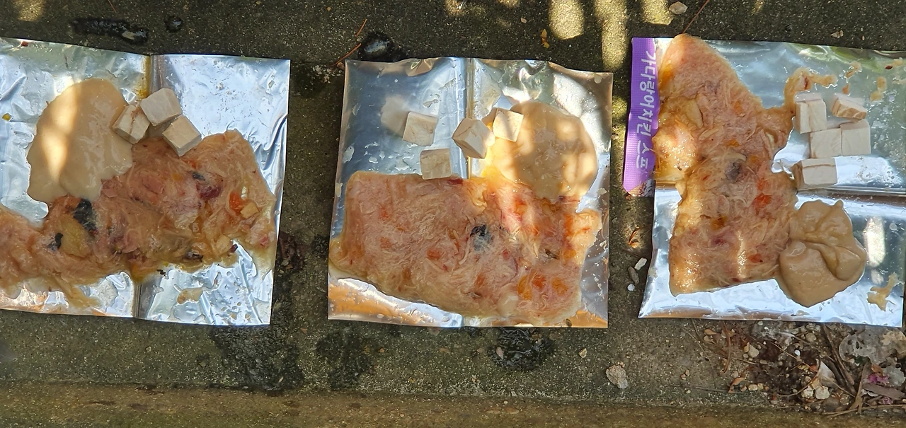 야옹님들이 지나다니는 길에 아침 공양을 준비해 둔다. 개미군단 진격 전에 드시러들 와야 할 텐데...