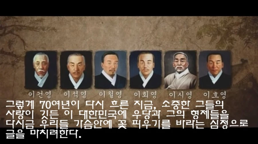 또 소개할 역사 인물로 독립운동가, '이회영'을 소개한다. 이회영이란 인물은 대대로 문벌이 높은 가문에 부와 권력이 엄청난 사람이었다. 나라가 망하고 난 뒤 거취를 만주로 정한다. 이후, 독립운동을 도모하기 위해 600억이 넘는 돈을 마련해 만주로 건너가 집과 학교를 짓고, 독립투사를 양성하고 지원했다고 한다. 그 어마어마한 돈도 3년 만에 바닥이 나고 온 가족이 굶주림을 강냉이죽으로 달래 가며 살았다고 한다.