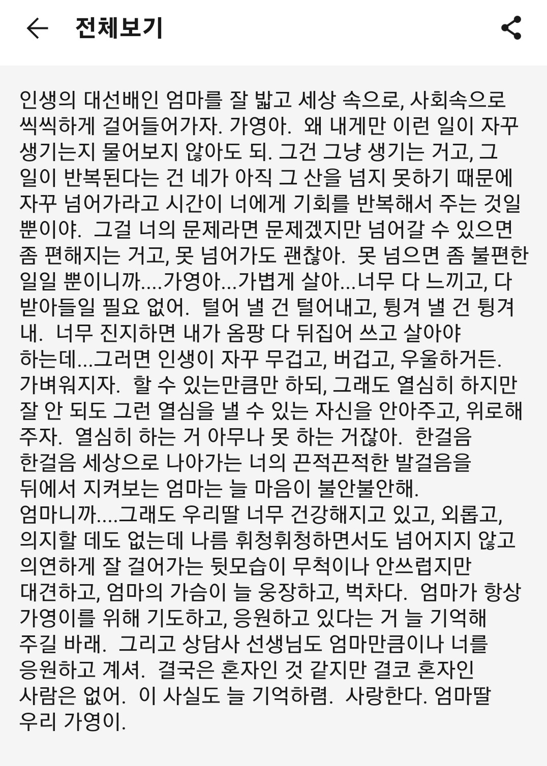 하지만 괜찮다. 이미 그 길을 내가 한 참 전에 지나왔으니 내가 잘 도와줄 수 있고 나보다도 대차고, 씩씩하고, 현명한 딸의 장점은 앞으로의 사회생활에 큰 도움이 될 테니까 문제없다. 딸도, 나도 다시 시작할 수 있고, 앞으로도 언제든 늘 다시 시작할 수 있다.