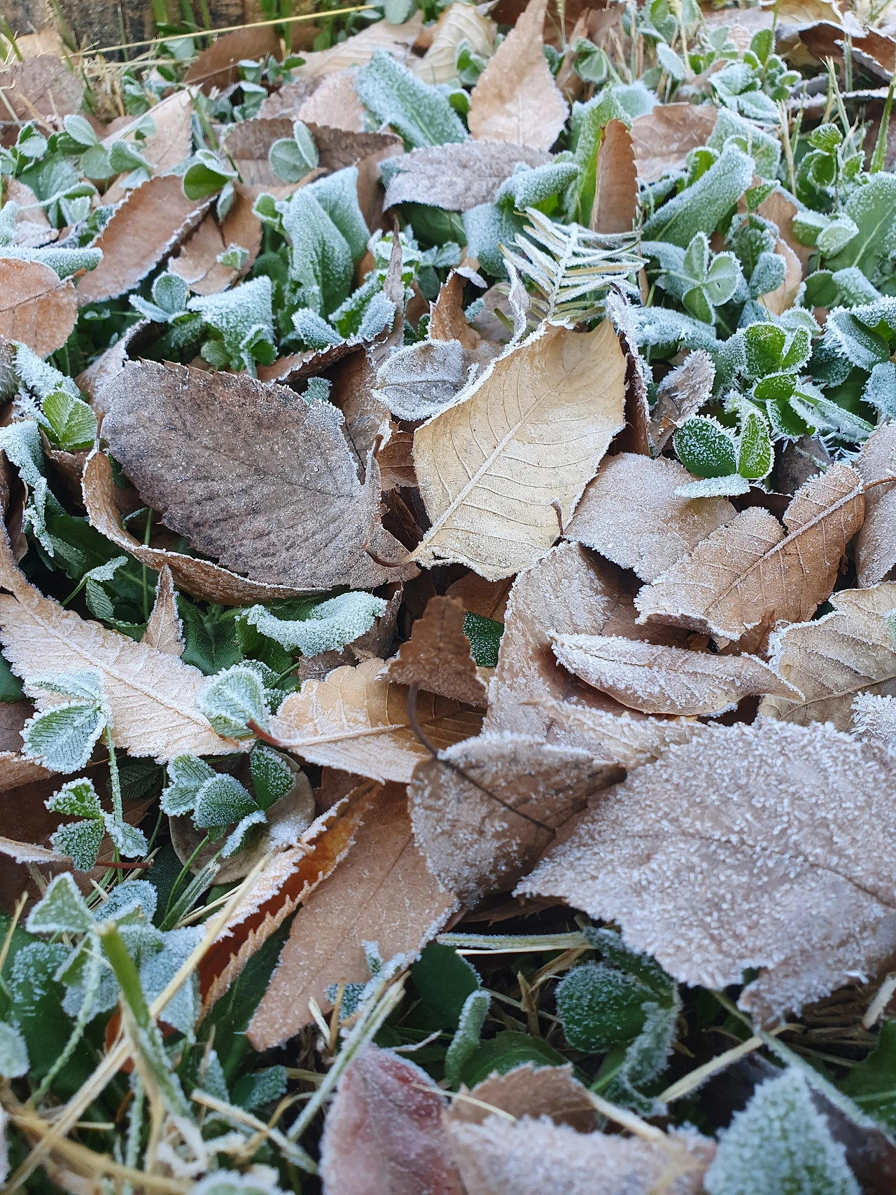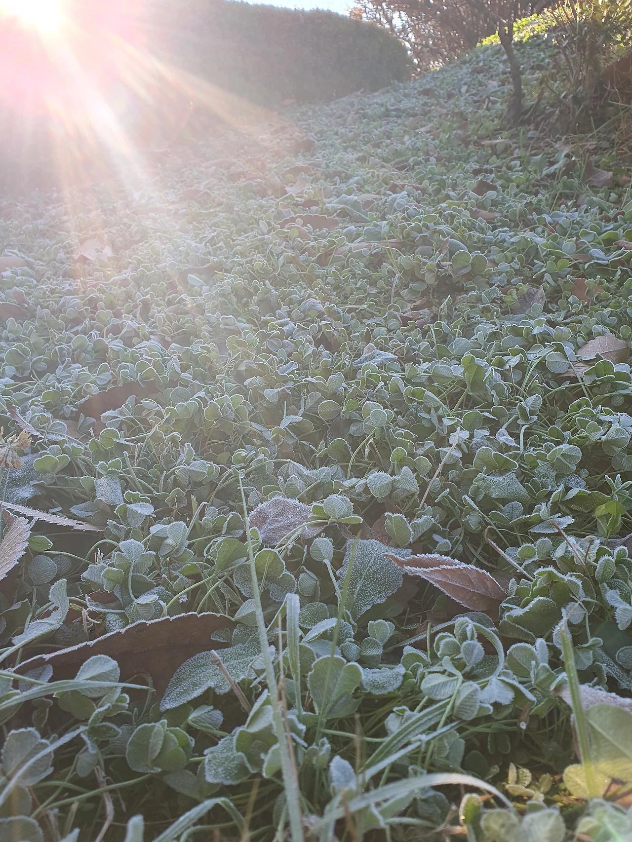 나무나 풀 위에 햇볕을 받아 보석처럼 빛나는 서리.